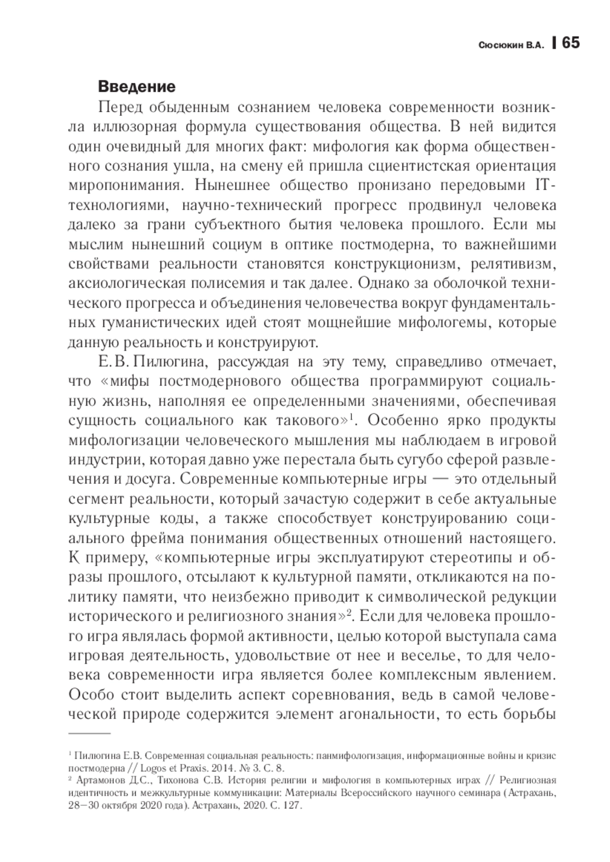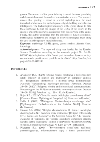 1. Артамонов Д. С. История религии и мифология в компьютерных играх // Религиозная идентичность и межкультурные коммуникации: Материалы Всероссийского научного семинара (Астрахань, 28-30 октября 2020 года) / под общ. ред. А. П. Романовой, Д. А. Черничкина. Астрахань: Астраханский государственный университет, 2020. С. 126-132. EDN: PGWIHW