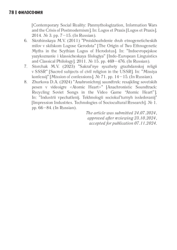3. Журкова Д. А. Анахроничный саундтрек: ресайклинг советских песен в видеоигре “Atomic Heart” // Индустрии впечатлений. Технологии социокультурных исследований. 2024. № 1. С. 66-84. EDN: AODUEF