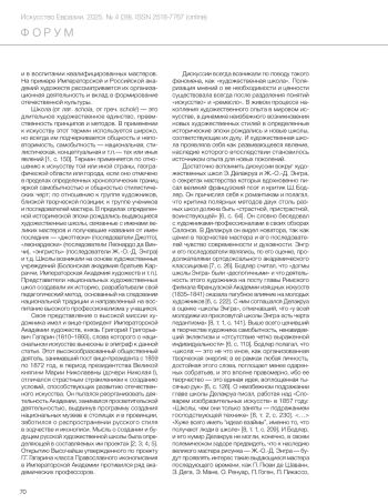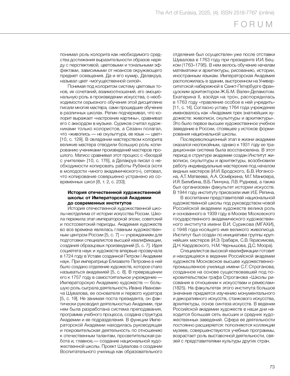 This article explores the phenomenon of the artistic school in a historical context, drawing on both Russian and international art. It presents various perspectives from prominent artists on the role and significance of schools, which are closely tied to the goals of a national school - preserving traditions and training highly skilled specialists. By examining examples from European art academies and the Imperial and also Russian Academy of Arts, it traces the evolution of ideas about the artistic school, its organizational activities, and its contribution to the formation of Russian and world culture. The article defines the concept of a “school” as a long-term artistic unity, emphasizing the continuity of principles and methods, as well as its distinctiveness in terms of nationality, style, and concept. It also raises the controversial issue of the need for and value of artistic schools, citing examples of the debates surrounding the schools of E. Delacroix and J. A. D. Ingres, and includes the opinions of A. Matisse, M. Vrubel, and P. Cézanne on the importance of breaking free from the influence of predecessors in order to find one’s own creative path. The article also highlights the role of schools in teaching the fundamentals of art, stimulating creativity, and developing professionalism. It references the ideas of P. Chistyakov on pedagogical principles aimed at fostering student independence, and I. Repin on the importance of hard work and the transmission of creative energy. Additionally, the article analyses the importance of mastering technique, drawing, and colour as fundamental components of art education, providing examples from the approaches of L. da Vinci, E. Degas, and I. Repin. Finally, it examines the formation and development of the Russian artistic school in a historical context, beginning with the Imperial Academy of Arts and its transformations after the Revolution, and continuing through to the modern Russian Academy of Arts, the V. I. Surikov Moscow State Academic Institute, and the S. G. Stroganov Moscow Higher School of Art and Design.