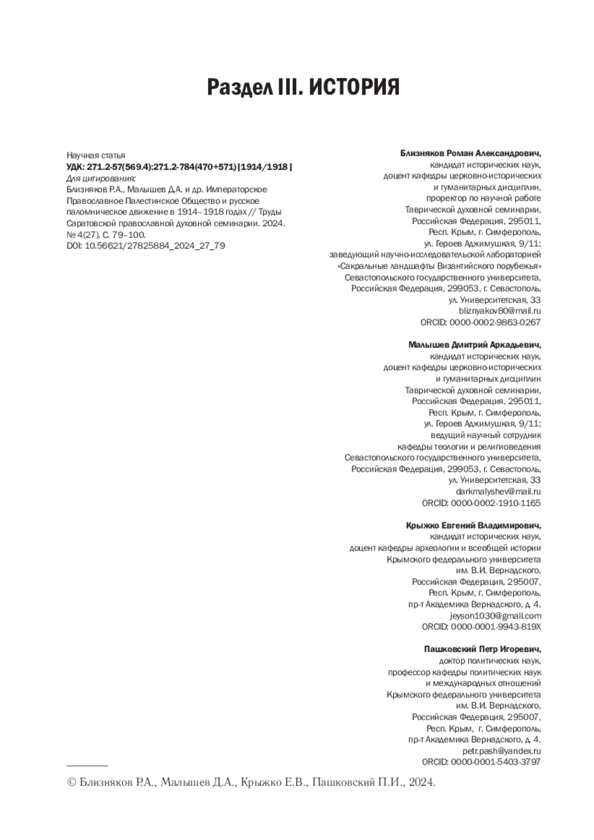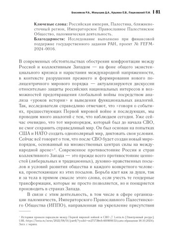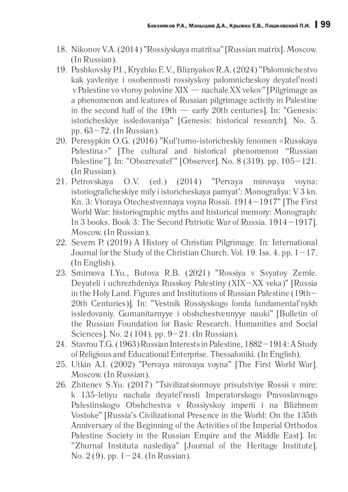 23. Пашковский П. И., Крыжко Е. В., Близняков Р. А. Паломничество как явление и особенности российской паломнической деятельности в Палестине во второй половине XIX - начале XX веков // Genesis: исторические исследования. 2024. № 5. С. 63-72. EDN: CXQALD