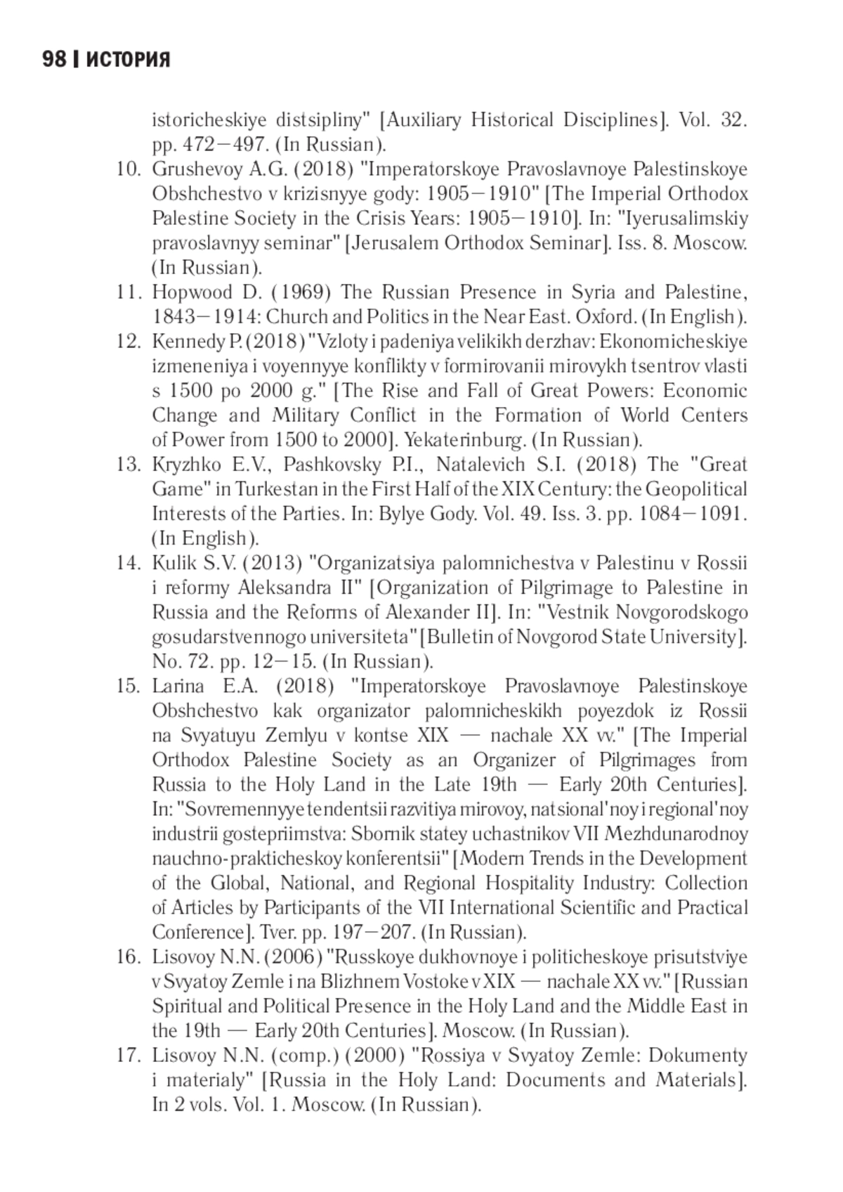 9. Грушевой А. Г. Императорское Православное Палестинское Общество: обзор истории до 1917 г. // Вспомогательные исторические дисциплины. 2013. Т. 32. С. 472-497. EDN: VRNGRF