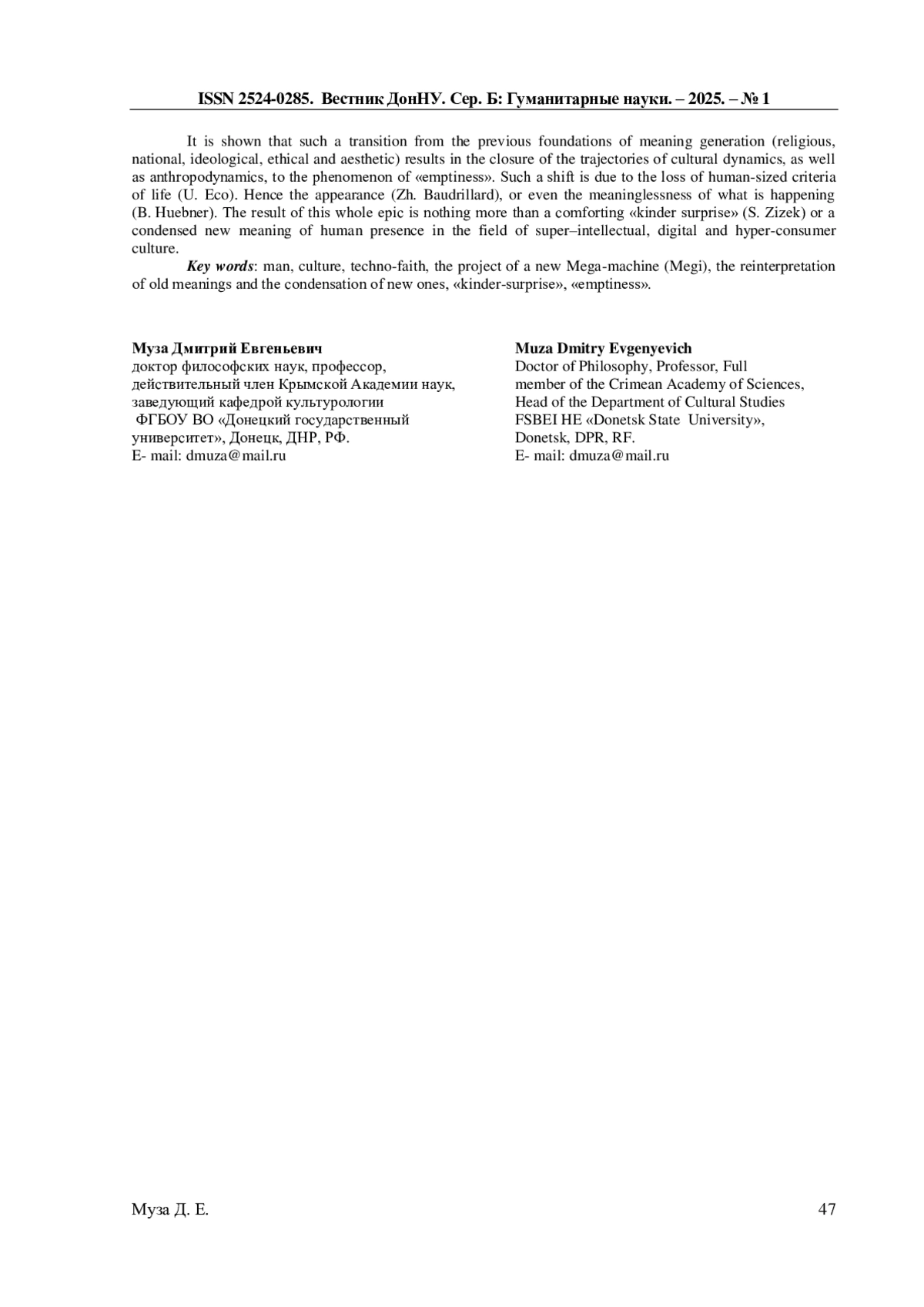 9. Муза Д.Е. Логика цифровизации: к модальности человеко-технологического присутствия-и-забвения / Д.Е. Муза // Вестник ДонНУ. Серия Б. Гуманитарные науки. - 2024. - № 2. - С. 34-38.