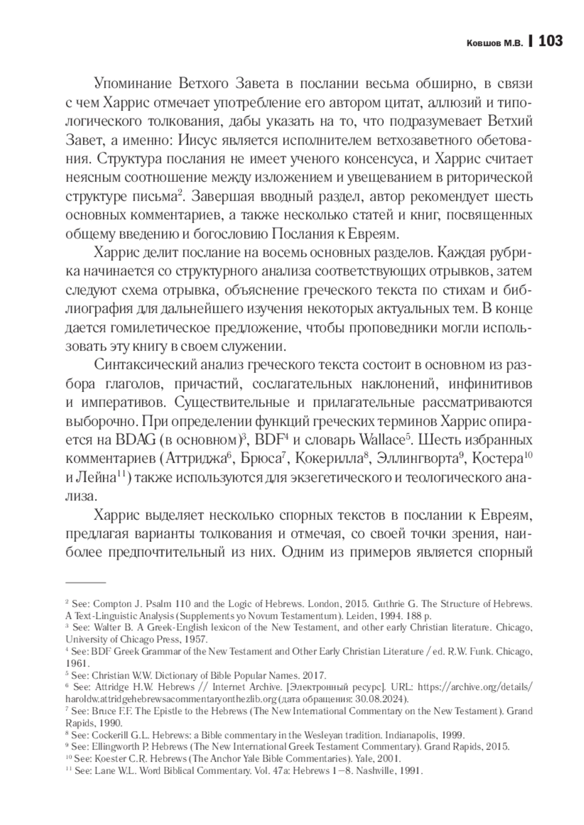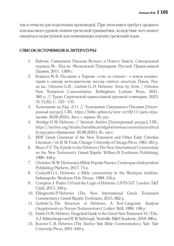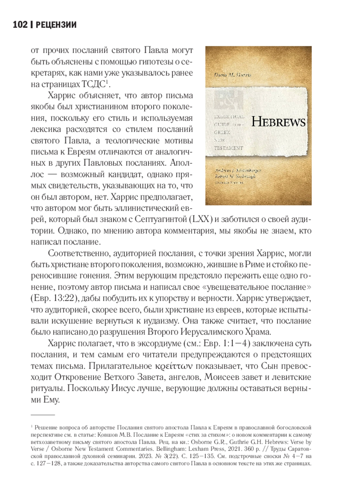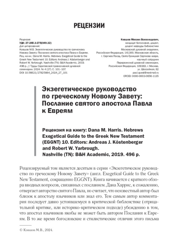 2. Ковшов М. В. Послание к Евреям “стих за стихом”: о новом комментарии к самому ветхозаветному письму святого апостола Павла. Рец. на кн.: Osborne G. R., Guthrie G. H. Hebrews: Verse by Verse / Osborne New Testament Commentaries. Bellingham: Lexham Press, 2021. 360 р. // Труды Саратовской православной духовной семинарии. 2023. № 3 (22). С. 125-135. EDN: TJQPDM