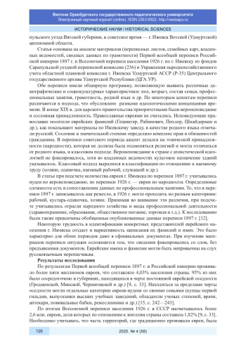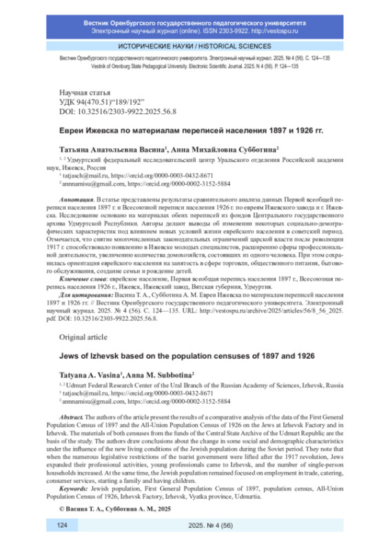В статье представлены результаты сравнительного анализа данных Первой всеобщей переписи населения 1897 г. и Всесоюзной переписи населения 1926 г. по евреям Ижевского завода и г. Ижевска. Исследование основано на материалах обеих переписей из фондов Центрального государственного архива Удмуртской Республики. Авторы делают выводы об изменении некоторых социально-демографических характеристик под влиянием новых условий жизни еврейского населения в советский период. Отмечается, что снятие многочисленных законодательных ограничений царской власти после революции 1917 г. способствовало появлению в Ижевске молодых специалистов, расширению сферы профессиональной деятельности, увеличению количества домохозяйств, состоявших из одного человека. При этом сохранилась ориентация еврейского населения на занятость в сфере торговли, общественного питания, бытового обслуживания, создание семьи и рождение детей.
