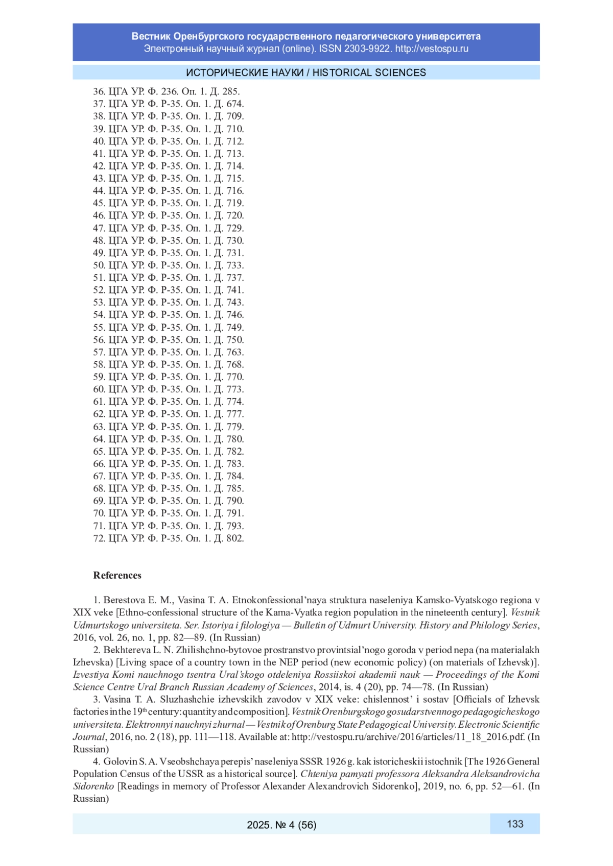 1. Берестова Е. М., Васина Т. А. Этноконфессиональная структура населения Камско-Вятского региона в XIX веке // Вестник Удмуртского университета. Сер. История и филология. 2016. Т. 26, № 1. С. 82-89.