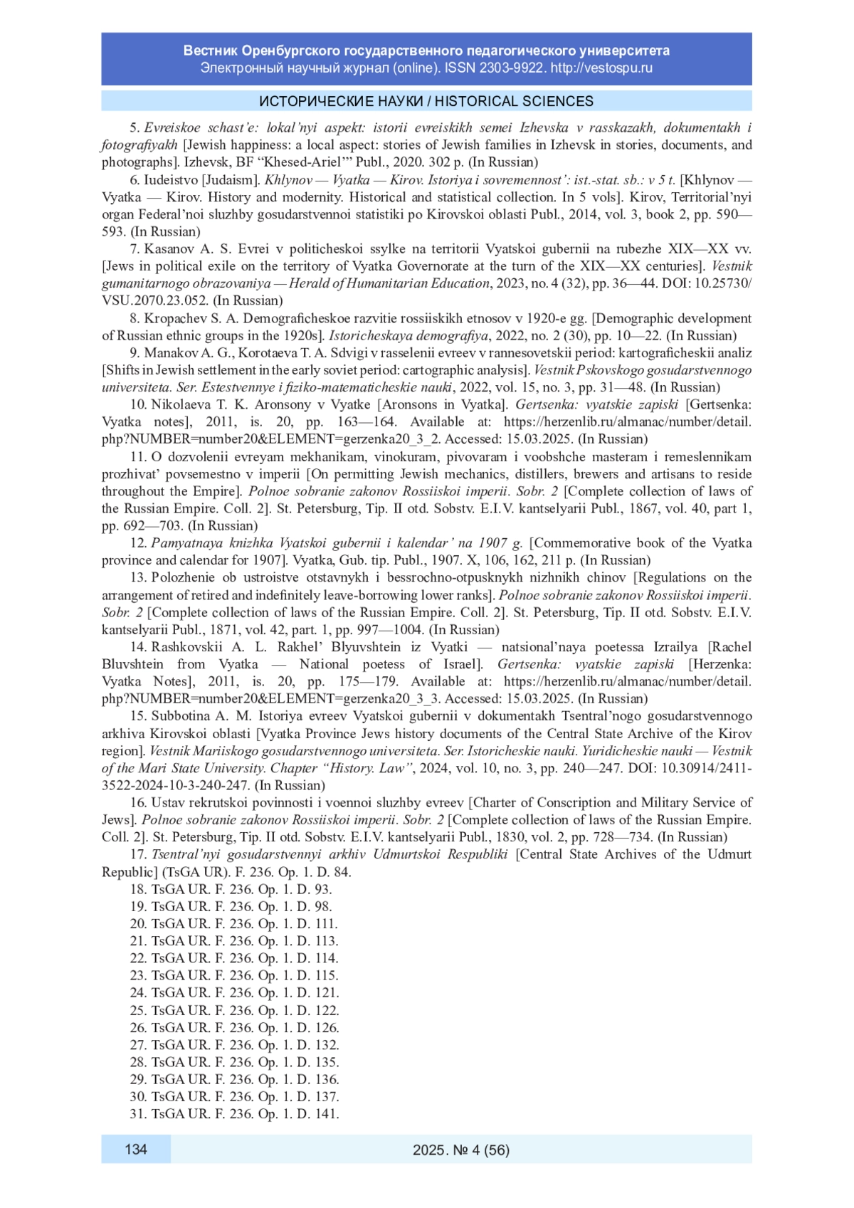 7. Касанов А. С. Евреи в политической ссылке на территории Вятской губернии на рубеже XIX-XX вв. // Вестник гуманитарного образования. 2023. № 4 (32). С. 36-44. DOI: 10.25730/VSU.2070.23.052 EDN: PKBAQU