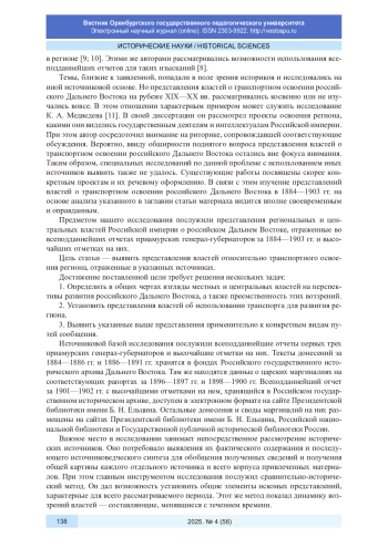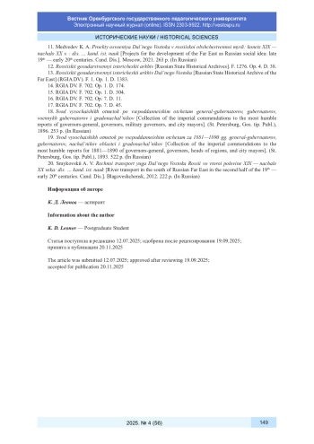 10. Матханова Н. П., Родигина Н. Н. “Приамурье не Сибирь”: репрезентация отличий Сибири и Дальнего Востока в отчетах генерал-губернаторов второй половины XIX в. // Вестник Томского государственного университета. 2021. № 463. С. 117-124. DOI: 10.17223/15617793/463/15