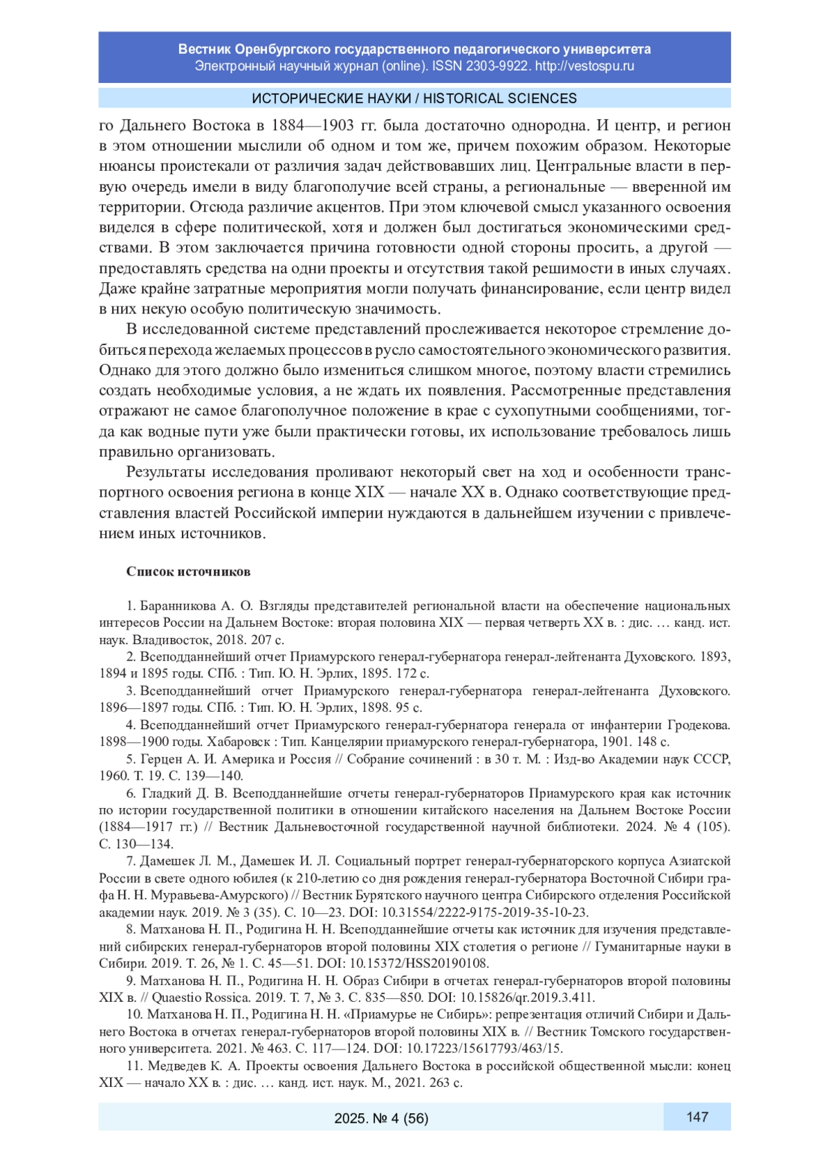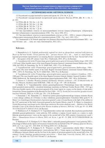 8. Матханова Н. П., Родигина Н. Н. Всеподданнейшие отчеты как источник для изучения представлений сибирских генерал-губернаторов второй половины XIX столетия о регионе // Гуманитарные науки в Сибири. 2019. Т. 26, № 1. С. 45-51. DOI: 10.15372/HSS20190108 EDN: ZBZEDZ