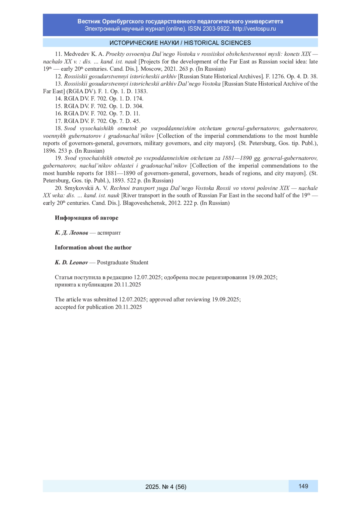 20. Смыковский А. В. Речной транспорт юга Дальнего Востока России во второй половине XIX - начале XX века: дис. … канд. ист. наук. Благовещенск, 2012. 222 с. EDN: QFVZDJ