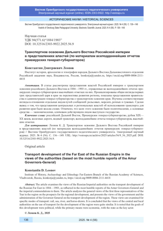 В статье рассмотрены представления властей Российской империи о транспортном освоении российского Дальнего Востока в 1884-1903 гг., отраженные во всеподданнейших отчетах приамурских генерал-губернаторов и высочайших отметках на них. Проанализированы общие взгляды первых трех представителей царя в крае на перспективы развития региона, показаны представления правительства и администрации генерал-губернаторства о транспортном освоении края. Изучены соответствующие взгляды в отношении отдельных видов путей сообщений: рельсовых, морских, речных и гужевых. Сделан вывод о том, что представления центральных и региональных властей об использовании транспорта для развития края были весьма схожи. Отмечено, что цели этого освоения были политическими, а основные средства - экономическими, ключевым действующим лицом выступало государство.