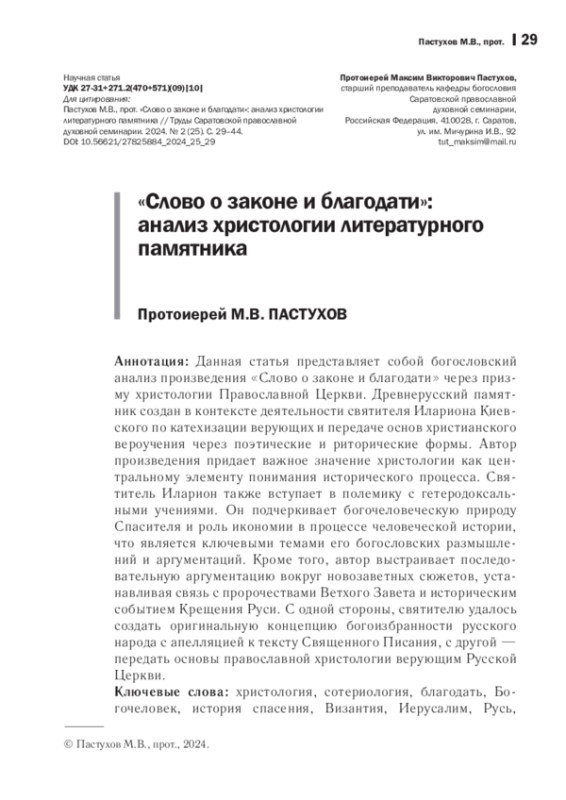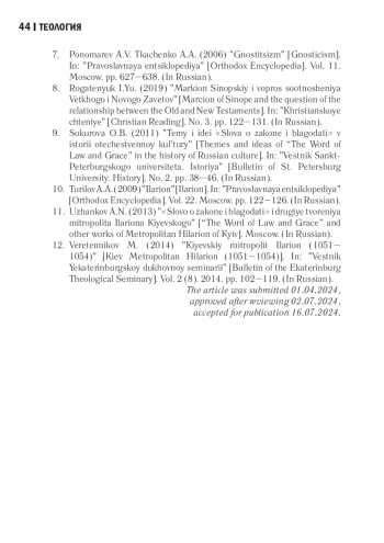 14. Сокурова О. Б. Темы и идеи “Слова о законе и благодати” в истории отечественной культуры // Вестник Санкт-Петербургского университета. История. 2011. № 2. С. 38-46. EDN: NTUCKP