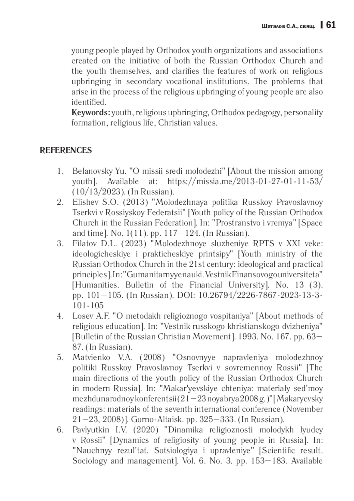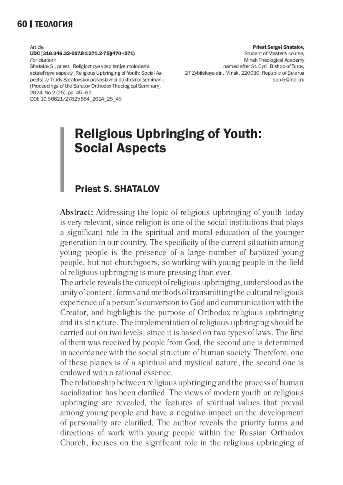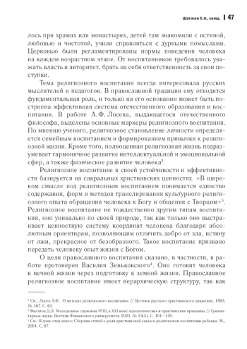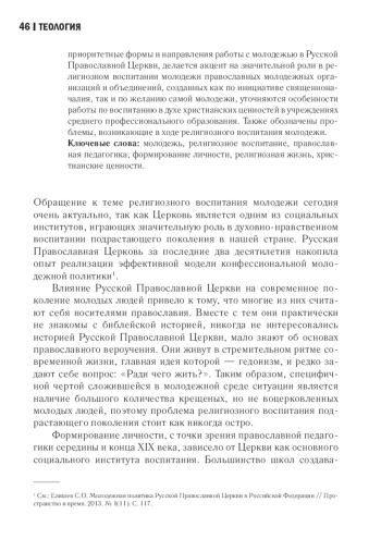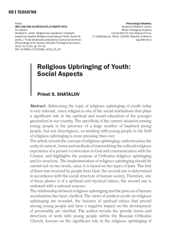Обращение к теме религиозного воспитания молодежи сегодня очень актуально, так как Церковь является одним из социальных институтов, играющих значительную роль в духовнонравственном воспитании подрастающего поколения в России. Специфической чертой сложившейся в молодежной среде ситуации является наличие большого количества крещеных, но не воцерковленных молодых людей, поэтому вопрос о работе с молодежью в сфере религиозного воспитания стоит как никогда остро. В статье раскрыто понятие религиозного воспитания, понимаемого как единство содержания, форм и методов транслирования культурного религиозного опыта обращения человека к Богу и общения с Творцом, определены цель православного религиозного воспитания и его структура. Отмечается, что осуществление религиозного воспитания должно проводиться в двух плоскостях, так как в его основе лежат два вида законов: одни законы люди получили от Бога, другие определяются в соответствии с социальным устройством человеческого общества. Соответственно, одна из этих плоскостей носит духовно-мистический характер, вторая наделена рациональной сущностью. Автор уточняет взаимосвязь религиозного воспитания с процессом социализации человека, раскрывает воззрения современной молодежи на религиозное воспитание, определяет особенности духовных ценностей, преобладающих в молодежной среде и оказывающих негативное влияние на становление личности. Раскрываются также приоритетные формы и направления работы с молодежью в Русской Православной Церкви, делается акцент на значительной роли в религиозном воспитании молодежи православных молодежных организаций и объединений, созданных как по инициативе священноначалия, так и по желанию самой молодежи, уточняются особенности работы по воспитанию в духе христианских ценностей в учреждениях среднего профессионального образования. Также обозначены проблемы, возникающие в ходе религиозного воспитания молодежи.