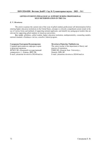 В статье рассматриваются текущее состояние вопроса профессионального самоопределения одаренных учащихся перед поступлением в высшие учебные заведения США, делается попытка критически осмыслить современные тенденции в использовании различных форм и методов поддержки талантливых абитуриентов, определить ключевые педагогические модели, которые актуальны для поддержки одаренных обучающихся в американских вузах.