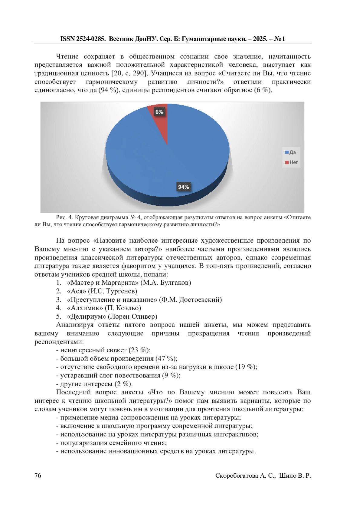4. Рудаков В. А. Результаты исследования читательских интересов школьников из числа коренных малочисленных народов Югры // Вестник угроведения. - 2018. - №3. - URL: https://cyberleninka.ru/article/n/rezultaty-issledovaniya-chitatelskih-interesov-shkolnikov-iz-chislakorennyh-malochislennyh-narodov-yugry (дата обращения: 10.12.2024). EDN: XZIOMX