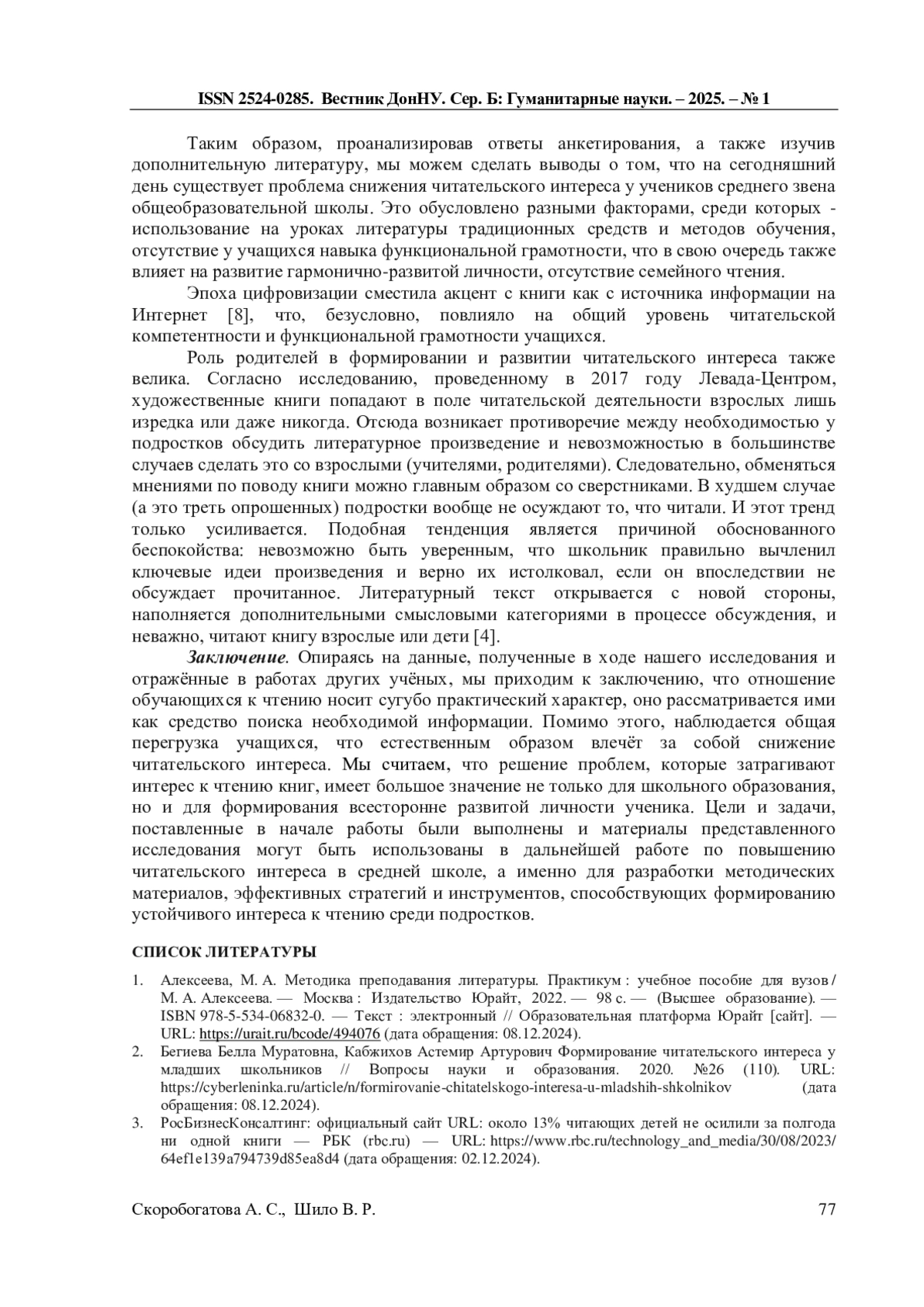 1. Алексеева, М. А. Методика преподавания литературы. Практикум: учебное пособие для вузов / М. А. Алексеева. - Москва: Издательство Юрайт, 2022. - 98 с. - (Высшее образование). - Текст: электронный // Образовательная платформа Юрайт [сайт]. - URL: https://urait.ru/bcode/494076 (дата обращения: 08.12.2024). ISBN: 978-5-534-06832-0