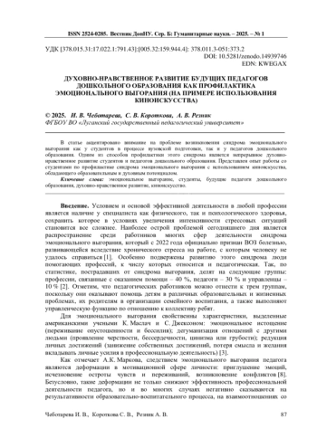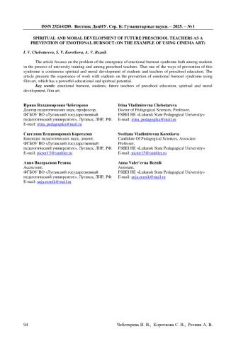 В статье акцентировано внимание на проблеме возникновения синдрома эмоционального выгорания как у студентов в процессе вузовской подготовки, так и у педагогов дошкольного образования. Одним из способов профилактики этого синдрома является непрерывное духовно- нравственное развитие студентов и педагогов дошкольного образования. Представлен опыт работы со студентами по профилактике синдрома эмоционального выгорания с использованием киноискусства, обладающего образовательным и духовным потенциалом.