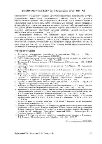 10. Науменко Н. М. Использование учебного кино как средства формирования общепрофессиональных и профессиональных компетенций студентов в процессе преподавания педагогических дисциплин / Н. М. Науменко, О. С. Шаврыгина // Человек и образование. - 2017. - № 2 (51). - С. 102-107.