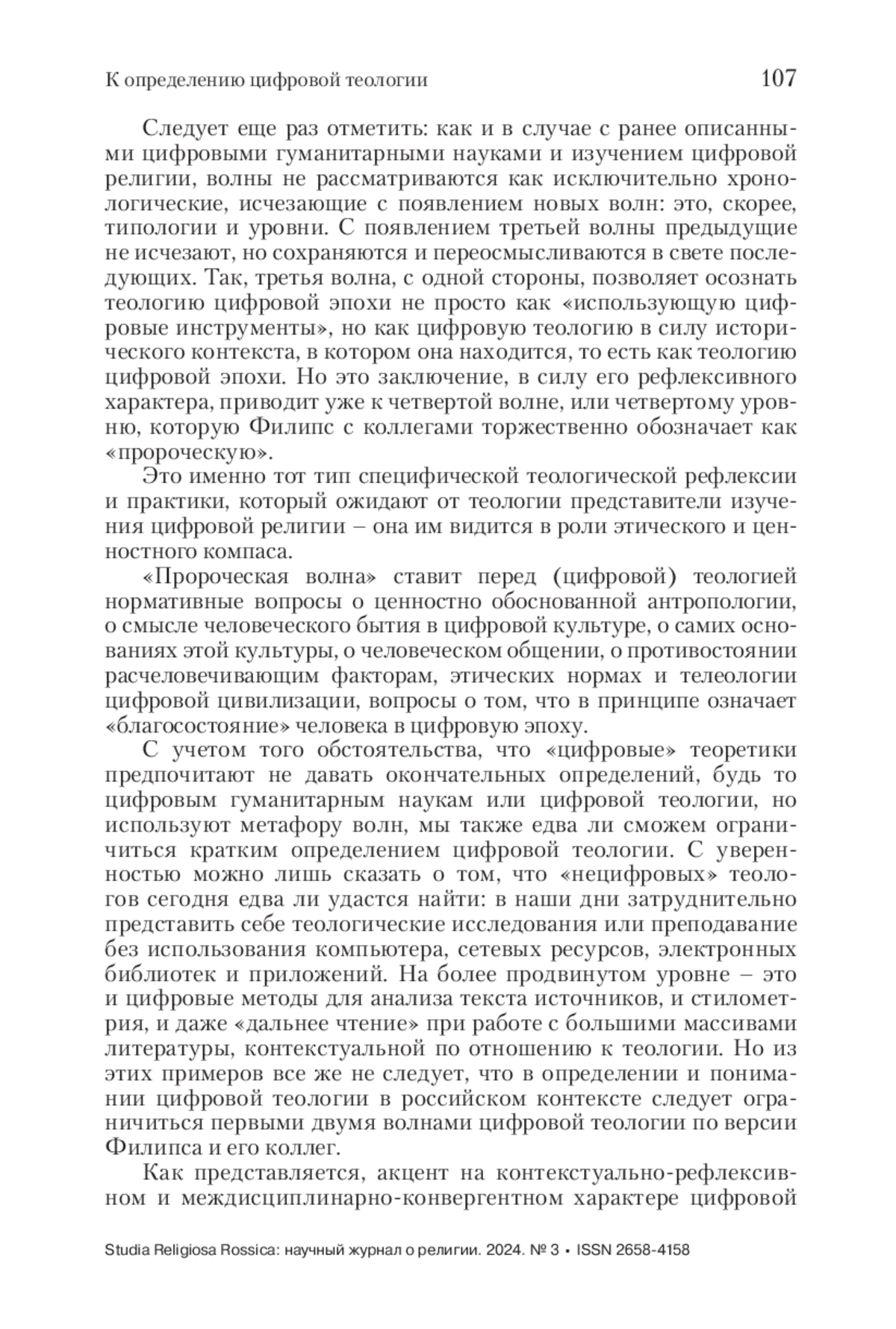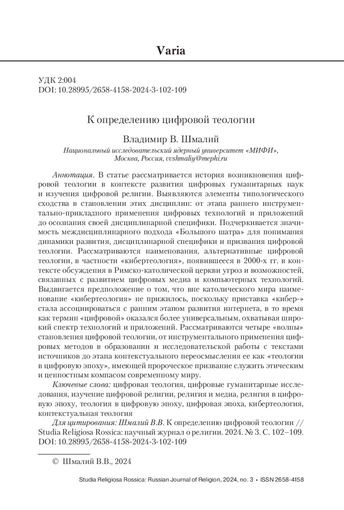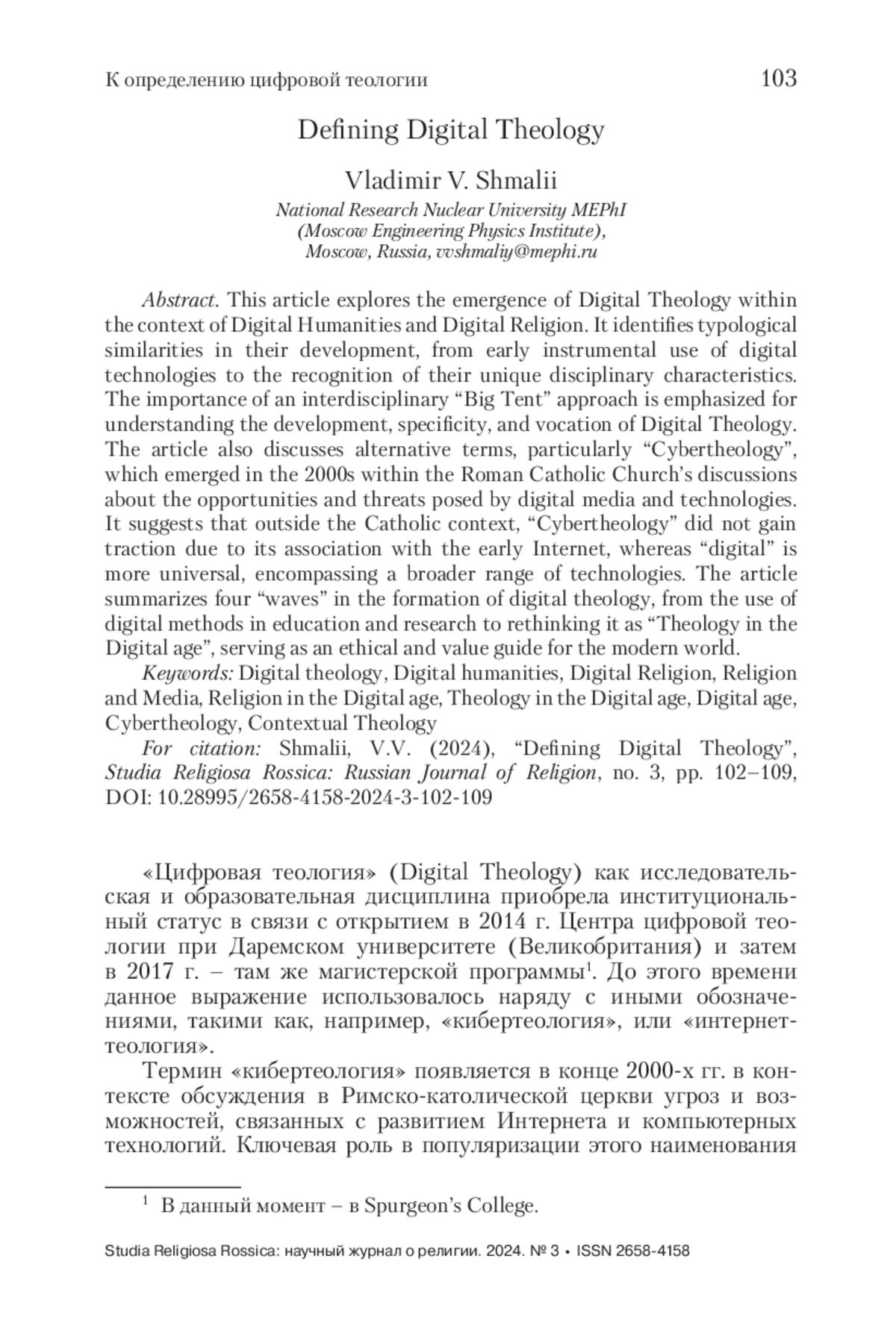 В статье рассматривается история возникновения цифровой теологии в контексте развития цифровых гуманитарных наук и изучения цифровой религии. Выявляются элементы типологического сходства в становлении этих дисциплин: от этапа раннего инструментально-прикладного применения цифровых технологий и приложений до осознания своей дисциплинарной специфики. Подчеркивается значимость междисциплинарного подхода «Большого шатра» для понимания динамики развития, дисциплинарной специфики и призвания цифровой теологии. Рассматриваются наименования, альтернативные цифровой теологии, в частности «кибертеология», появившееся в 2000-х гг. в контексте обсуждения в Римско-католической церкви угроз и возможностей, связанных с развитием цифровых медиа и компьютерных технологий. Выдвигается предположение о том, что вне католического мира наименование «кибертеология» не прижилось, поскольку приставка «кибер-» стала ассоциироваться с ранним этапом развития интернета, в то время как термин «цифровой» оказался более универсальным, охватывая широкий спектр технологий и приложений. Рассматриваются четыре «волны» становления цифровой теологии, от инструментального применения цифровых методов в образовании и исследовательской работы с текстами источников до этапа контекстуального переосмысления ее как «теологии в цифровую эпоху», имеющей пророческое призвание служить этическим и ценностным компасом современному миру.