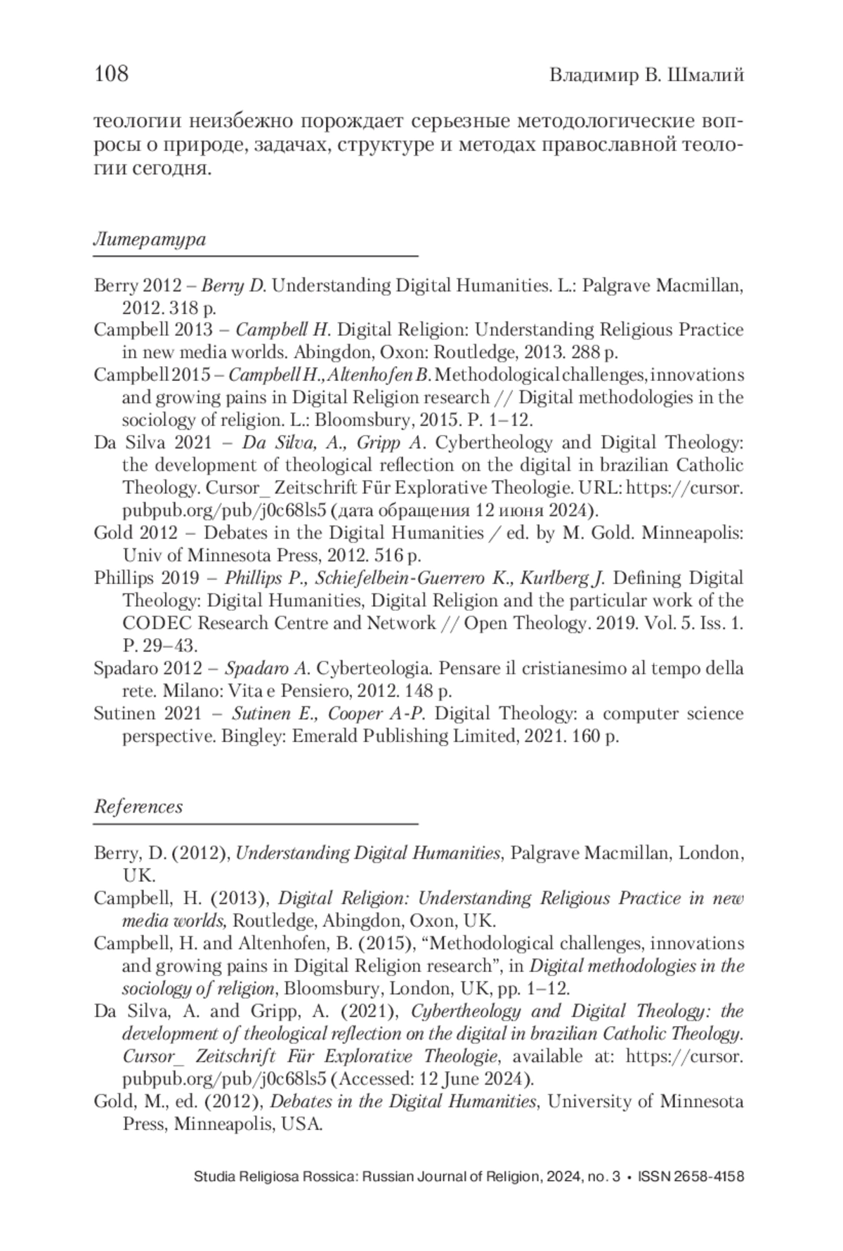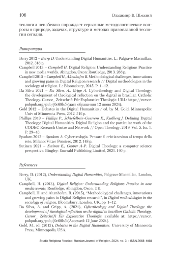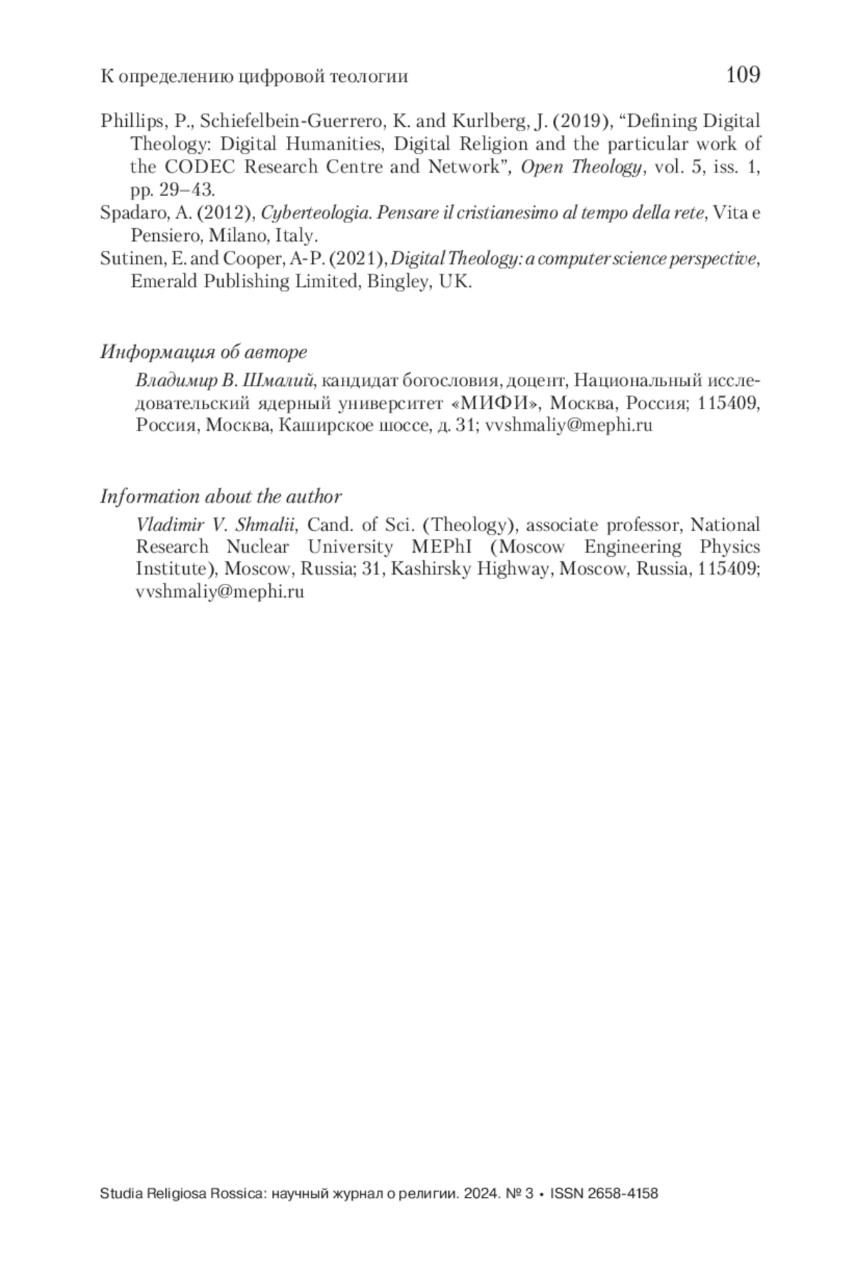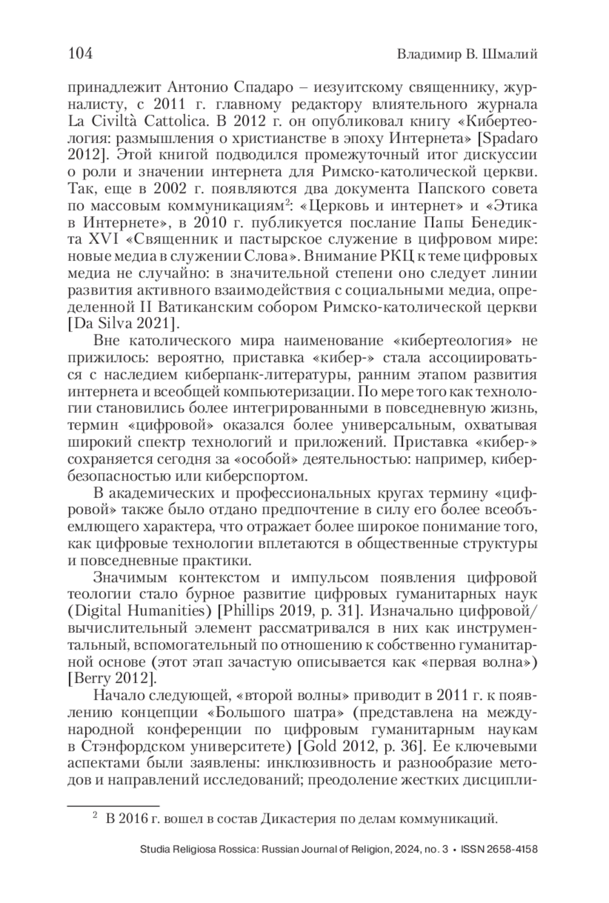 В статье рассматривается история возникновения цифровой теологии в контексте развития цифровых гуманитарных наук и изучения цифровой религии. Выявляются элементы типологического сходства в становлении этих дисциплин: от этапа раннего инструментально-прикладного применения цифровых технологий и приложений до осознания своей дисциплинарной специфики. Подчеркивается значимость междисциплинарного подхода «Большого шатра» для понимания динамики развития, дисциплинарной специфики и призвания цифровой теологии. Рассматриваются наименования, альтернативные цифровой теологии, в частности «кибертеология», появившееся в 2000-х гг. в контексте обсуждения в Римско-католической церкви угроз и возможностей, связанных с развитием цифровых медиа и компьютерных технологий. Выдвигается предположение о том, что вне католического мира наименование «кибертеология» не прижилось, поскольку приставка «кибер-» стала ассоциироваться с ранним этапом развития интернета, в то время как термин «цифровой» оказался более универсальным, охватывая широкий спектр технологий и приложений. Рассматриваются четыре «волны» становления цифровой теологии, от инструментального применения цифровых методов в образовании и исследовательской работы с текстами источников до этапа контекстуального переосмысления ее как «теологии в цифровую эпоху», имеющей пророческое призвание служить этическим и ценностным компасом современному миру.