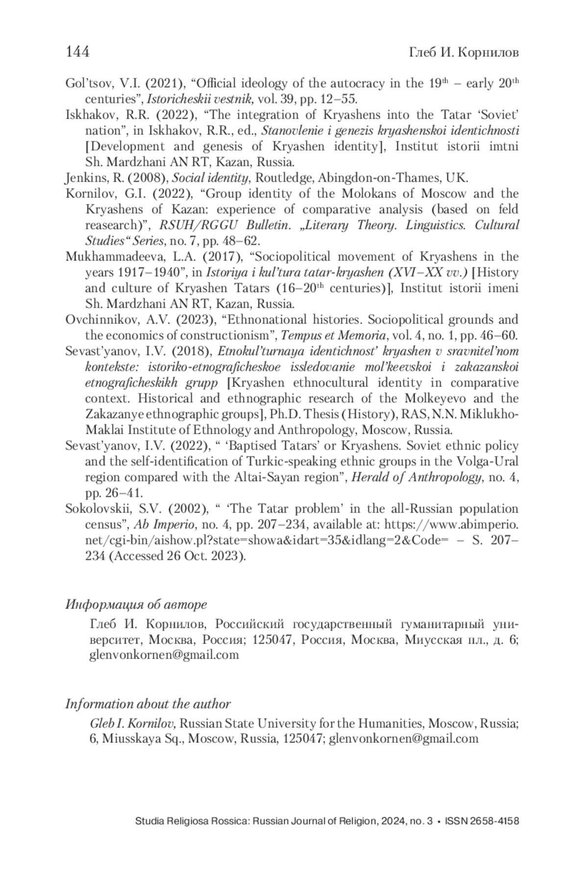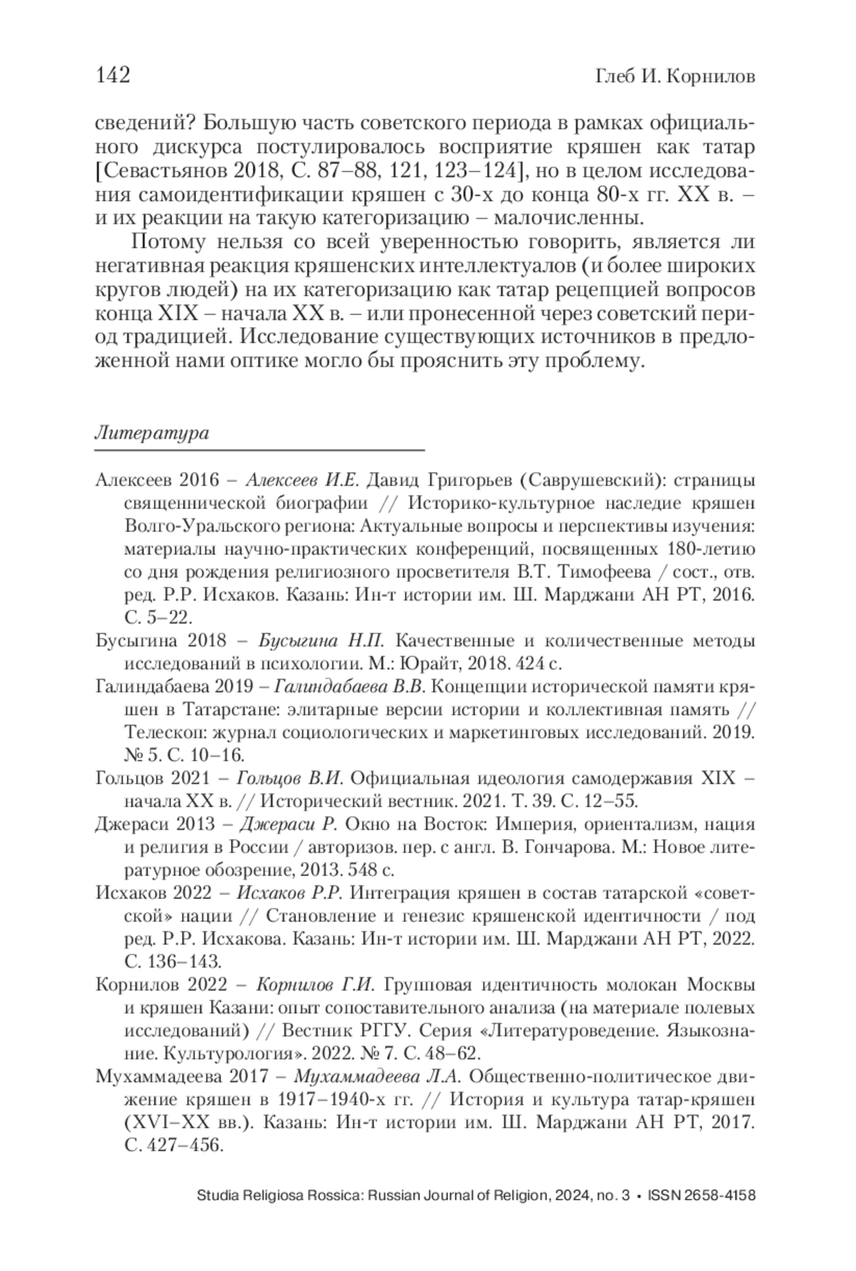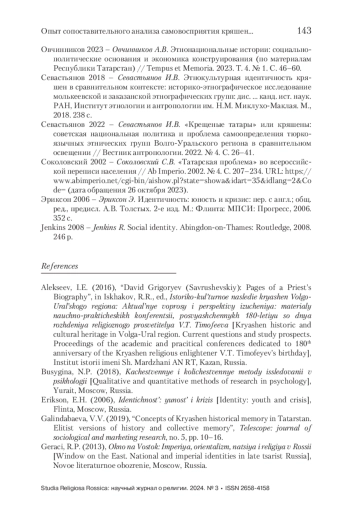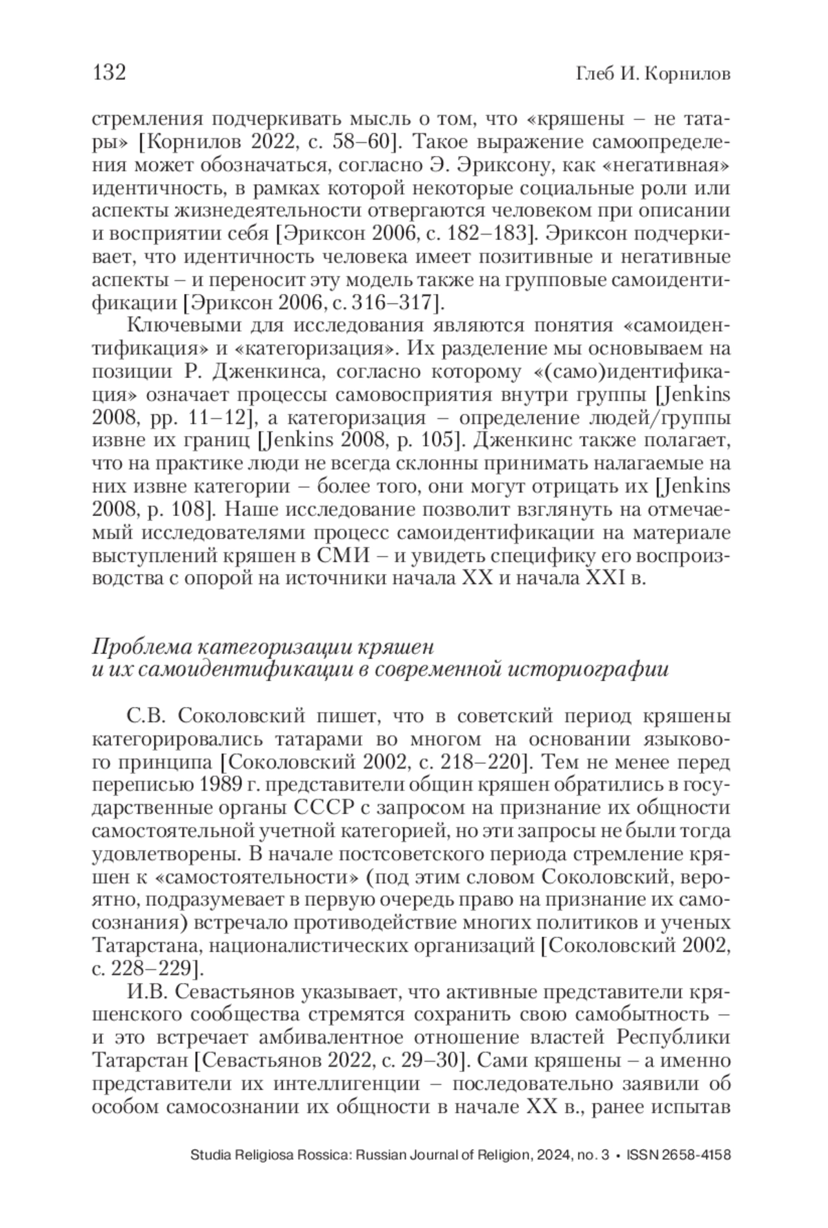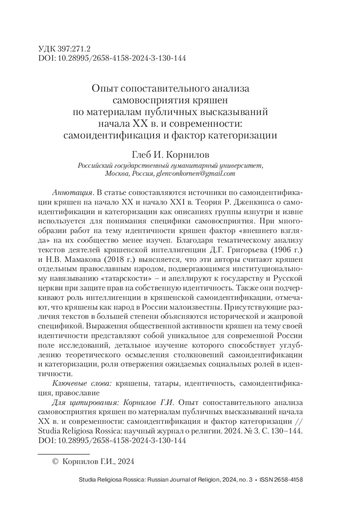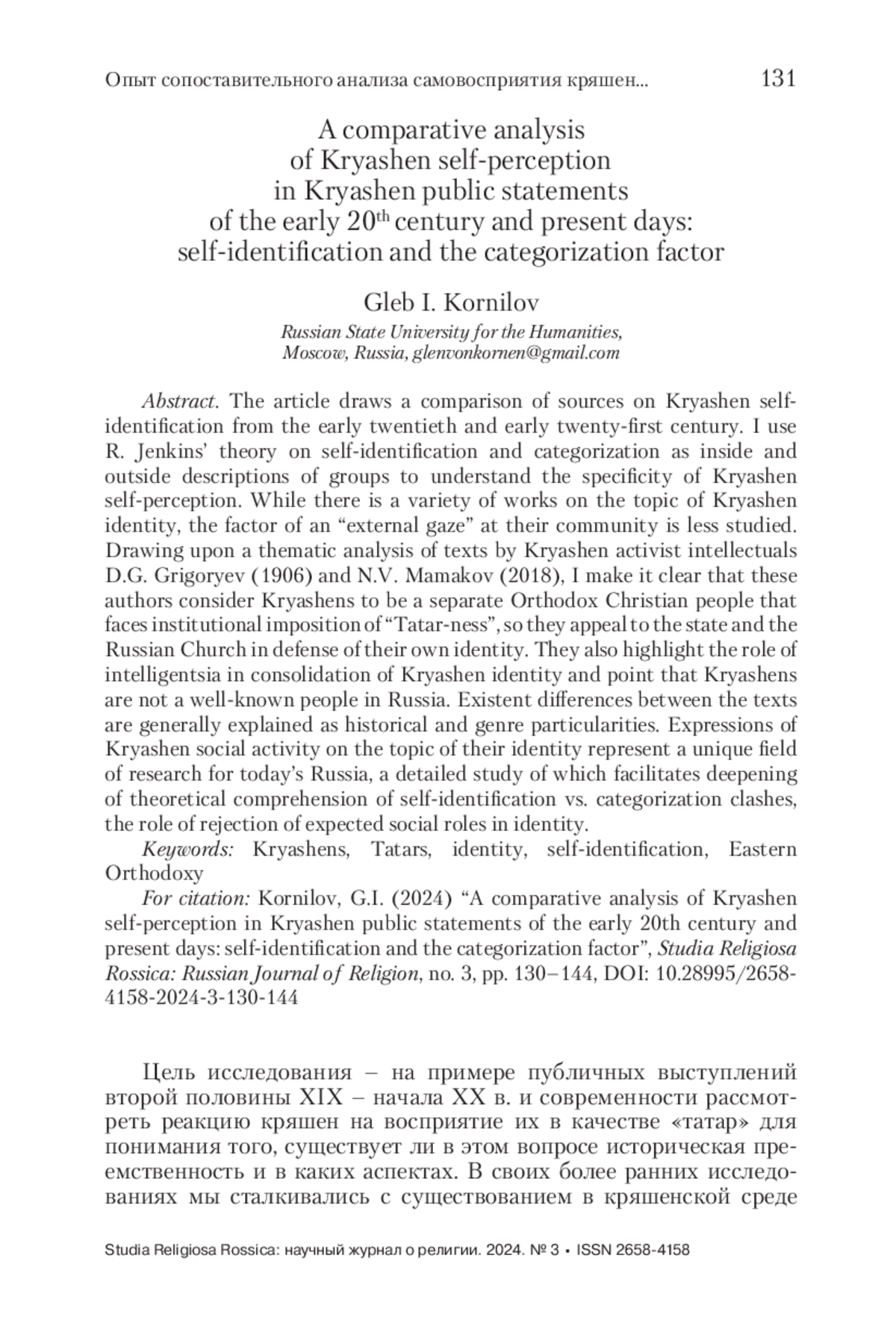 В статье сопоставляются источники по самоидентификации кряшен на начало XX и начало XXI в. Теория Р. Дженкинса о самоидентификации и категоризации как описаниях группы изнутри и извне используется для понимания специфики самовосприятия. При многообразии работ на тему идентичности кряшен фактор «внешнего взгляда» на их сообщество менее изучен. Благодаря тематическому анализу текстов деятелей кряшенской интеллигенции Д. Г. Григорьева (1906 г.) и Н. В. Мамакова (2018 г.) выясняется, что эти авторы считают кряшен отдельным православным народом, подвергающимся институциональному навязыванию «татарскости» – и апеллируют к государству и Русской церкви при защите прав на собственную идентичность. Также они подчеркивают роль интеллигенции в кряшенской самоидентификации, отмечают, что кряшены как народ в России малоизвестны. Присутствующие различия текстов в большей степени объясняются исторической и жанровой спецификой. Выражения общественной активности кряшен на тему своей идентичности представляют собой уникальное для современной России поле исследований, детальное изучение которого способствует углублению теоретического осмысления столкновений самоидентификации и категоризации, роли отвержения ожидаемых социальных ролей в идентичности.