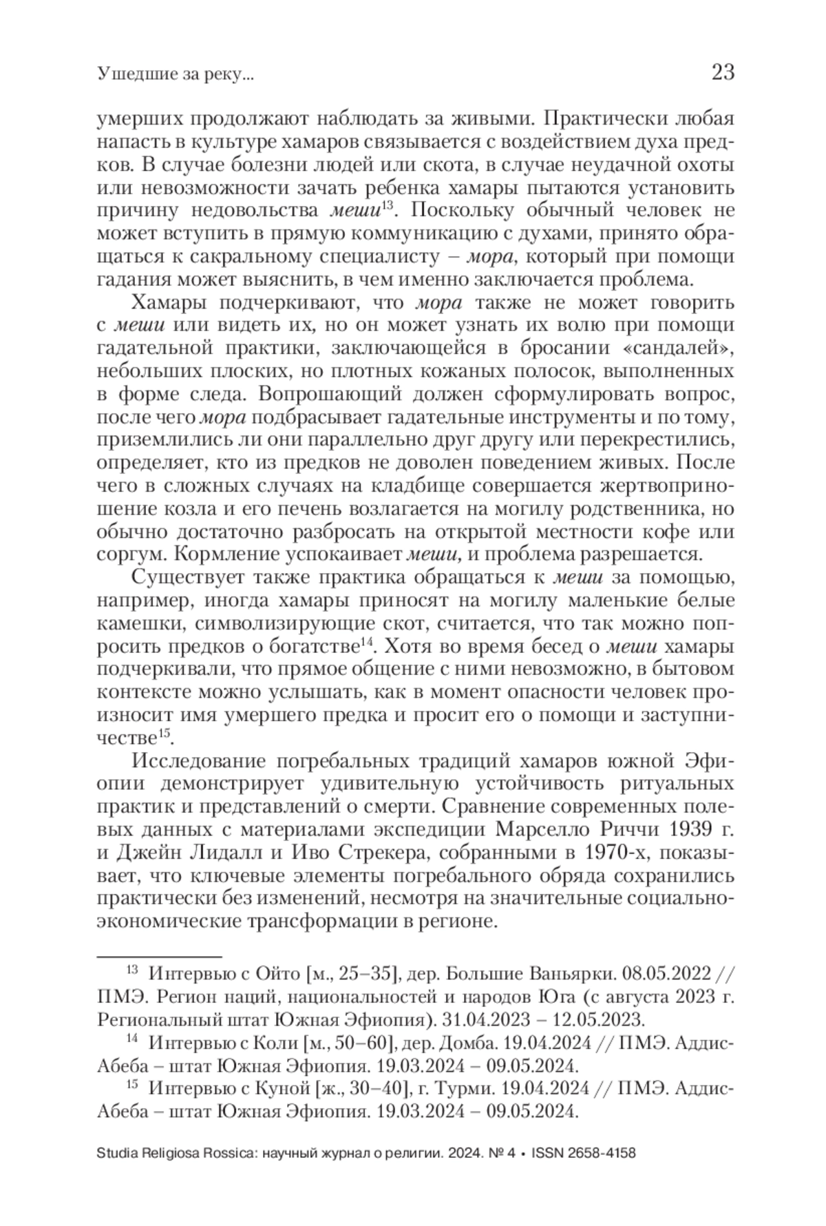 Данное исследование рассматривает погребальные традиции и представления о смерти у народа хамар в южной Эфиопии, демонстрируя устойчивость ритуальных практик. Сравнение современных полевых данных с материалами экспедиции Марселло Риччи 1930-х гг. и обширными этнографическими работами Джейн Лидалл и Иво Стрекера 1970-х гг. показывает, что ключевые элементы погребальных обрядов остались практически неизменными, несмотря на значительные социально-экономические трансформации в регионе. Исследование фокусируется на анализе погребальной традиции хамаров, состоящей из двух, разнесенных во времени, этапов: первоначального захоронения и последующего ритуала окончательного прощания (дуки була). Подобная практика отражает сложное понимание смерти как постепенного перехода в мир мертвых, затрагивающего как физическое тело, так и социальную личность умершего. Интервал между двумя церемониями служит периодом адаптации как для души умершего, так и для общины. Концепция загробного мира, расположенного за рекой Омо, демонстрирует горизонтальную модель вселенной, где мир мертвых воспринимается как зеркальное отражение мира живых. Эта концепция упрочивает связь между мирами, выражающуюся в регулярном, но опосредованном взаимодействии живых с духами предков (меши). Особый интерес представляет ритуал похорон вождей (битта), иллюстрирующий влияние социального статуса покойника на погребальные традиции. Случай непогребенного битта Элто показывает, как общество может адаптировать традиционные практики для сохранения социальной стабильности в критические моменты своей истории. Исследование способствует общему пониманию связей между погребальными традициями, космологией, социальной структурой и механизмами адаптации к изменениям в традиционных обществах.