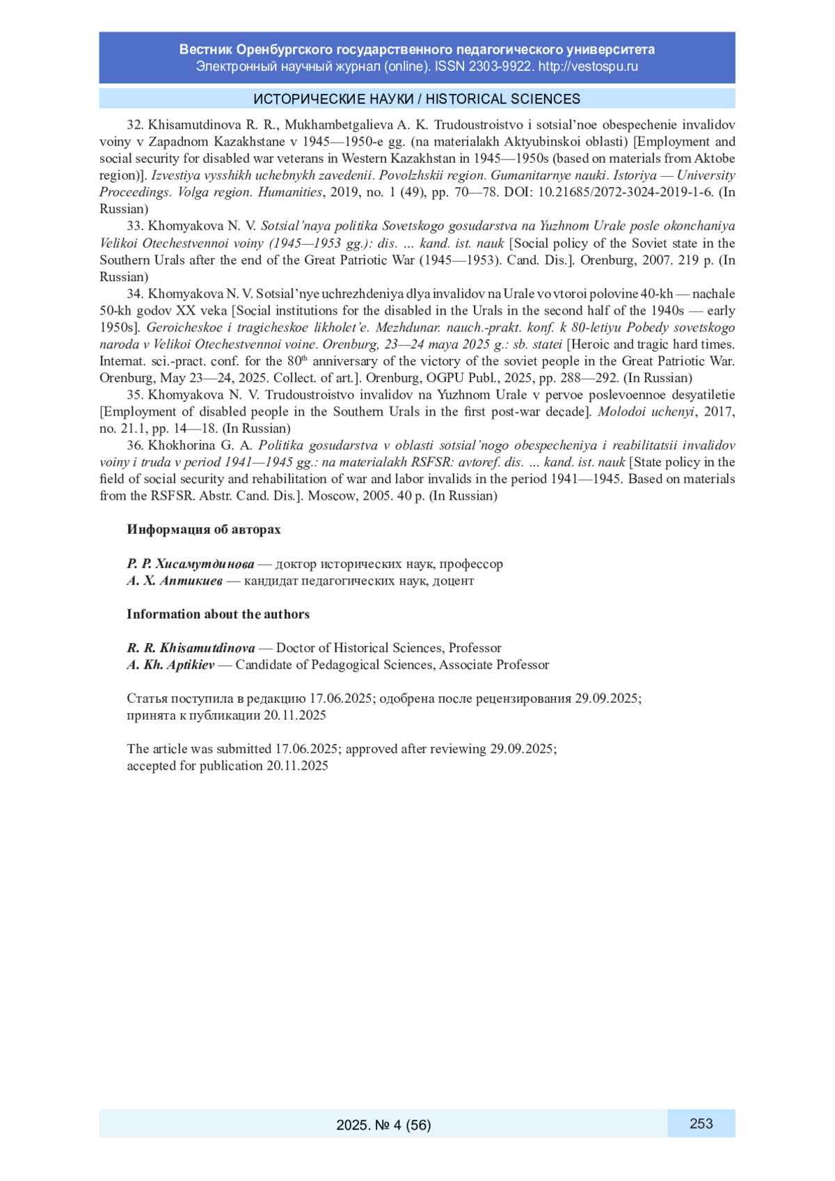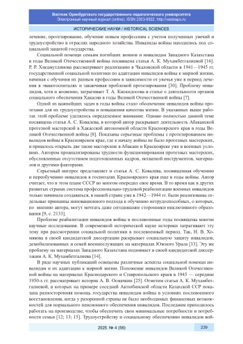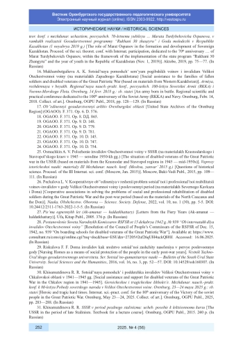 30. Хисамутдинова Р. Р. Социальная помощь и поддержка инвалидов Великой Отечественной войны в Чкаловской области в 1941-1945 гг. // Героическое и трагическое лихолетье. Междунар. науч.-практ. конф. к 80-летию Победы советского народа в Великой Отечественной войне. Оренбург, 23-24 мая 2025 г.: сб. статей / науч. ред. Р. Р. Хисамутдинова. Оренбург: Изд-во ОГПУ, 2025. С. 283-288. EDN: XTCGSU