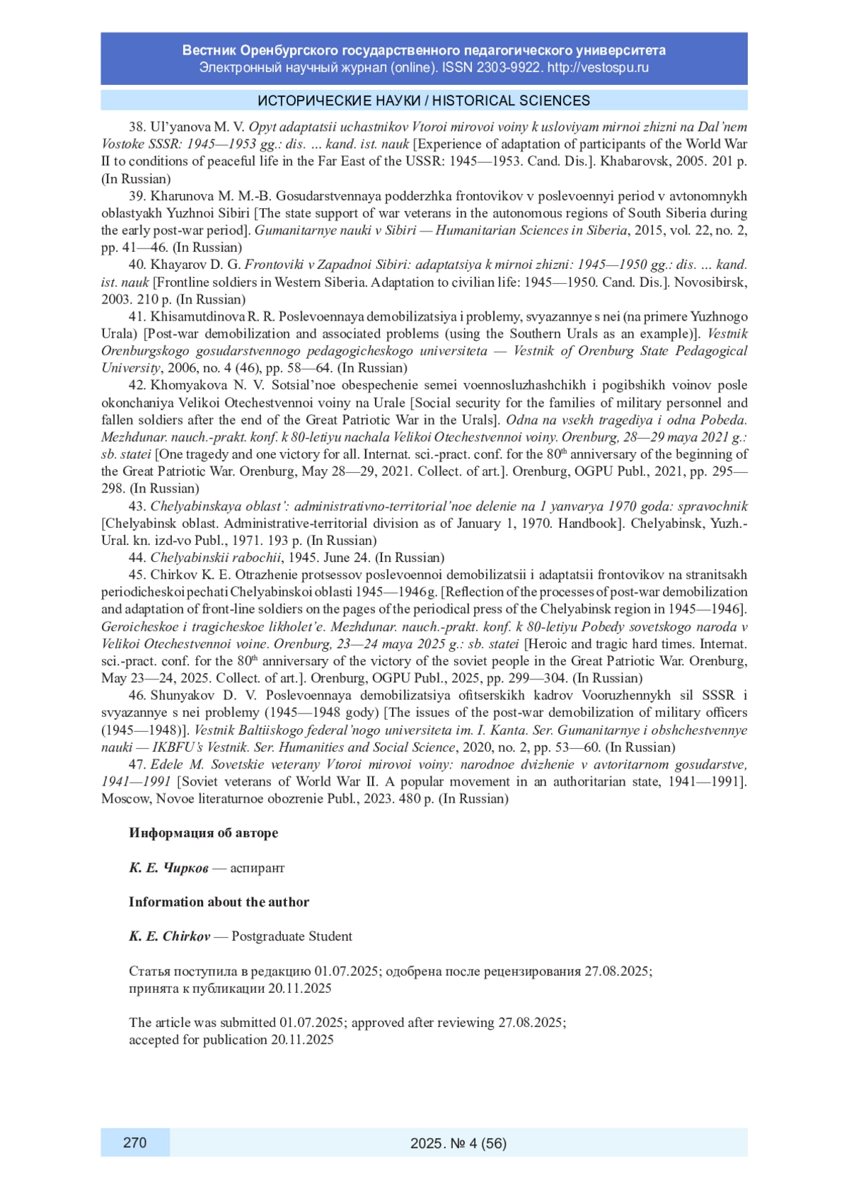 45. Чирков К. Е. Отражение процессов послевоенной демобилизации и адаптации фронтовиков на страницах периодической печати Челябинской области 1945-1946 г. // Героическое и трагическое лихолетье. Междунар. науч.-практ. конф. к 80-летию Победы советского народа в Великой Отечественной войне. Оренбург, 23-24 мая 2025 г.: сб. статей / науч. ред. Р. Р. Хисамутдинова. Оренбург: Изд-во ОГПУ, 2025. С. 299-304. EDN: TUXNOA