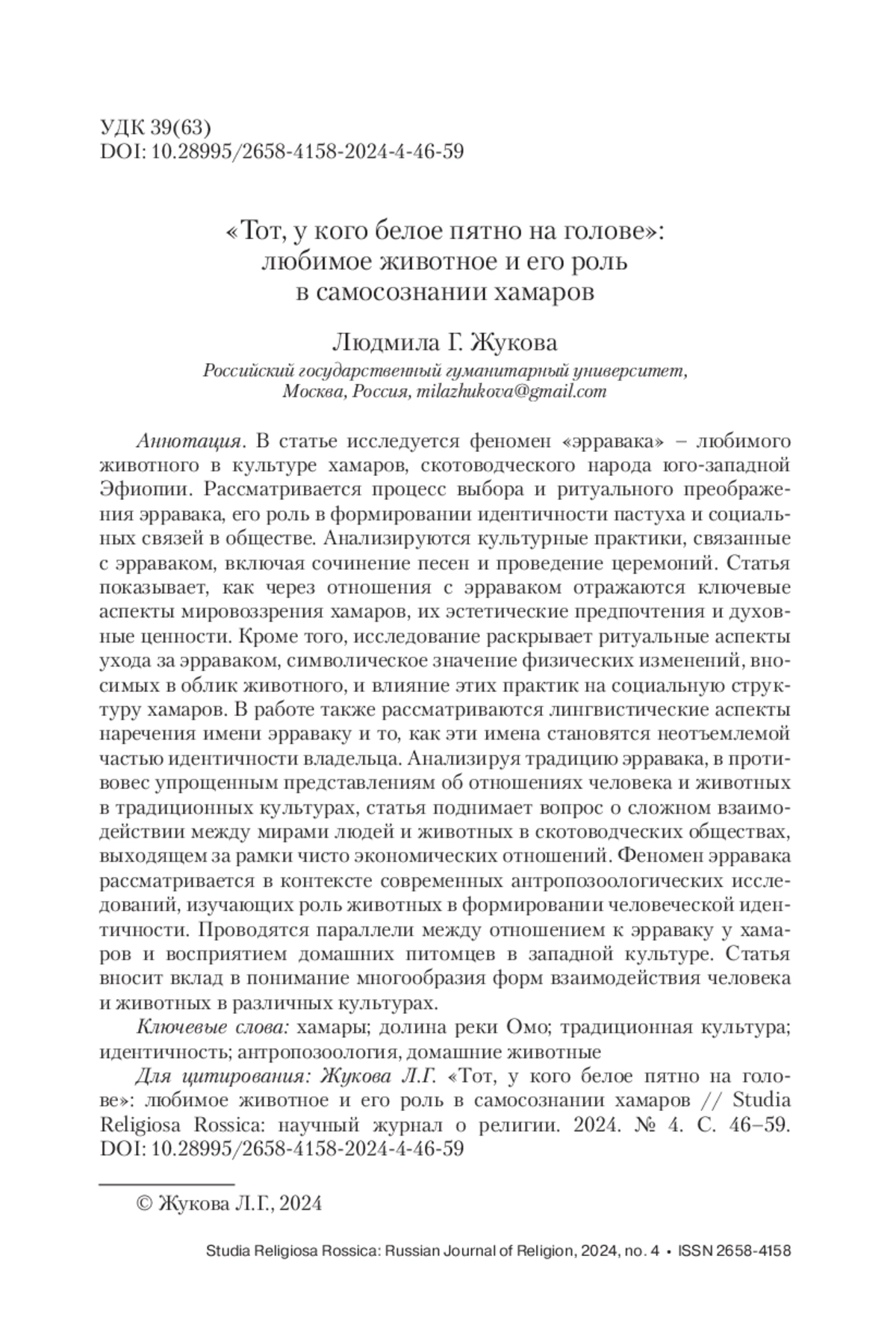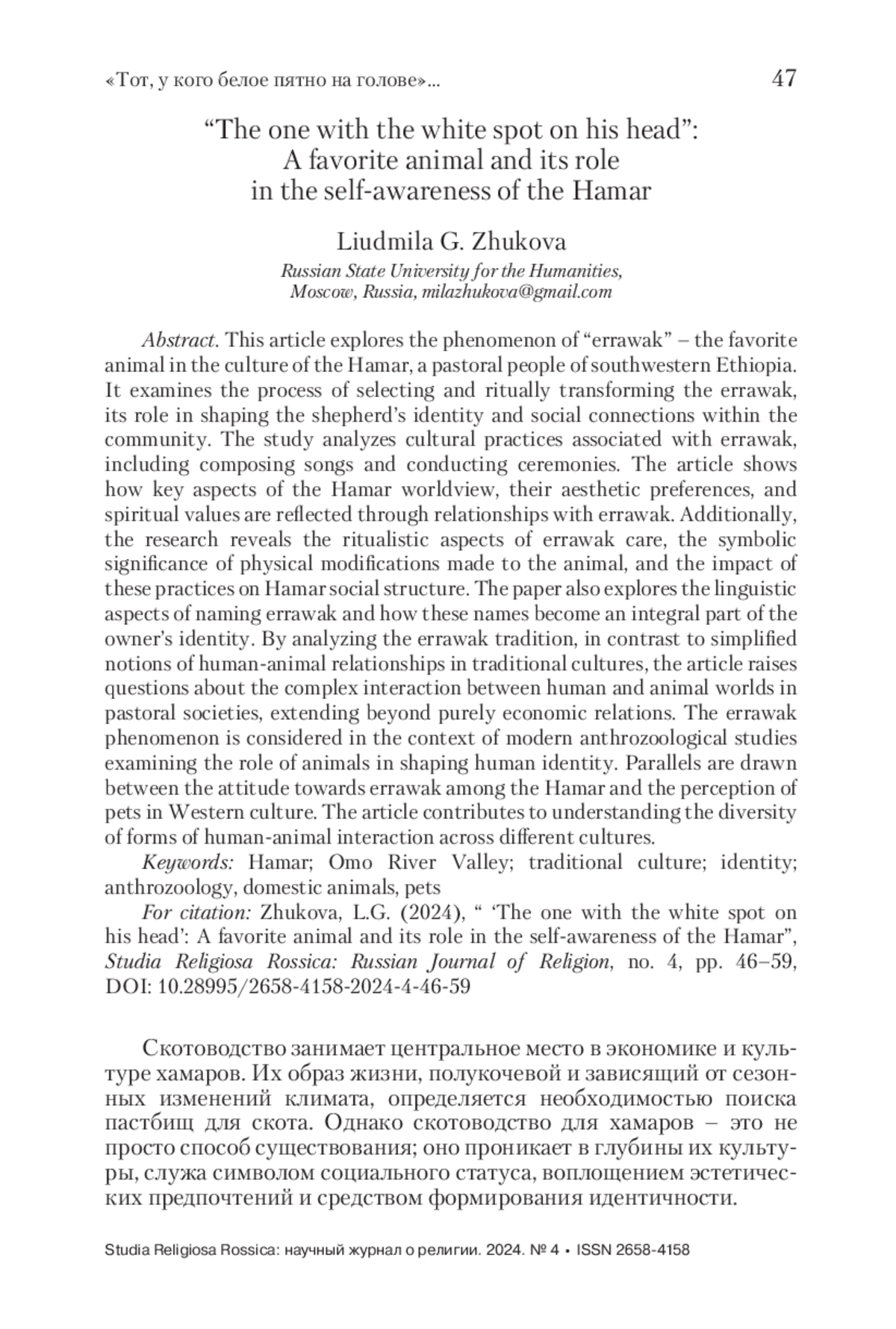 В статье исследуется феномен «эрравака» - любимого животного в культуре хамаров, скотоводческого народа юго-западной Эфиопии. Рассматривается процесс выбора и ритуального преображения эрравака, его роль в формировании идентичности пастуха и социальных связей в обществе. Анализируются культурные практики, связанные с эрраваком, включая сочинение песен и проведение церемоний. Статья показывает, как через отношения с эрраваком отражаются ключевые аспекты мировоззрения хамаров, их эстетические предпочтения и духовные ценности. Кроме того, исследование раскрывает ритуальные аспекты ухода за эрраваком, символическое значение физических изменений, вносимых в облик животного, и влияние этих практик на социальную структуру хамаров. В работе также рассматриваются лингвистические аспекты наречения имени эрраваку и то, как эти имена становятся неотъемлемой частью идентичности владельца. Анализируя традицию эрравака, в противовес упрощенным представлениям об отношениях человека и животных в традиционных культурах, статья поднимает вопрос о сложном взаимодействии между мирами людей и животных в скотоводческих обществах, выходящем за рамки чисто экономических отношений. Феномен эрравака рассматривается в контексте современных антропозоологических исследований, изучающих роль животных в формировании человеческой идентичности. Проводятся параллели между отношением к эрраваку у хамаров и восприятием домашних питомцев в западной культуре. Статья вносит вклад в понимание многообразия форм взаимодействия человека и животных в различных культурах.