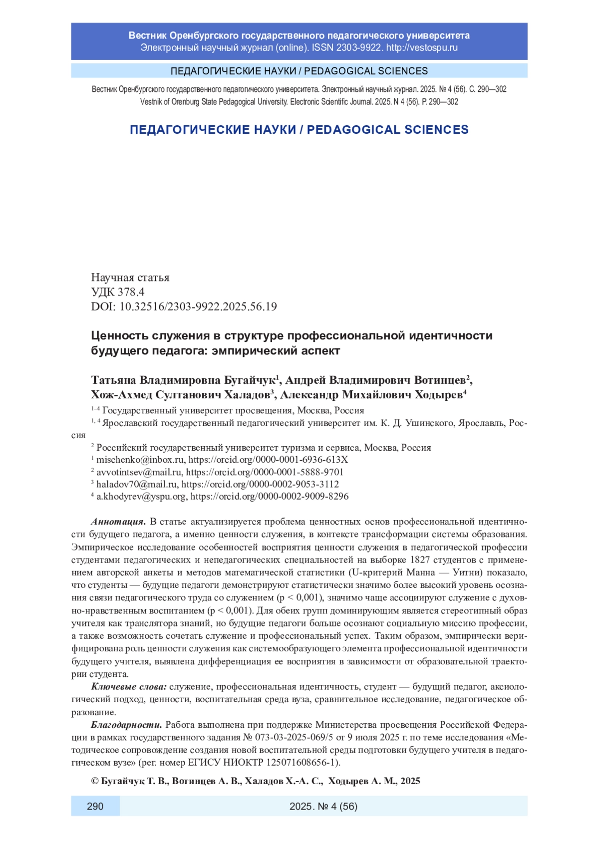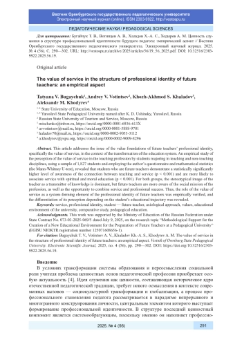 В статье актуализируется проблема ценностных основ профессиональной идентичности будущего педагога, а именно ценности служения, в контексте трансформации системы образования. Эмпирическое исследование особенностей восприятия ценности служения в педагогической профессии студентами педагогических и непедагогических специальностей на выборке 1827 студентов с применением авторской анкеты и методов математической статистики (U-критерий Манна - Уитни) показало, что студенты - будущие педагоги демонстрируют статистически значимо более высокий уровень осознания связи педагогического труда со служением (p < 0,001), значимо чаще ассоциируют служение с духовно-нравственным воспитанием (p < 0,001). Для обеих групп доминирующим является стереотипный образ учителя как транслятора знаний, но будущие педагоги больше осознают социальную миссию профессии, а также возможность сочетать служение и профессиональный успех. Таким образом, эмпирически верифицирована роль ценности служения как системообразующего элемента профессиональной идентичности будущего учителя, выявлена дифференциация ее восприятия в зависимости от образовательной траектории студента.