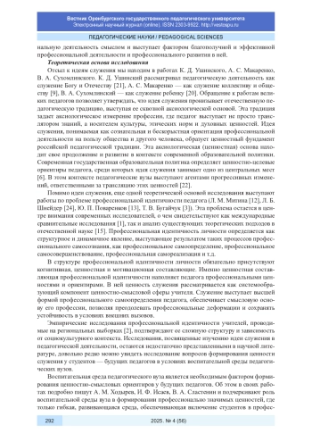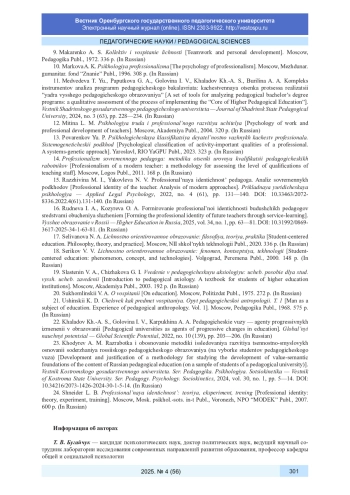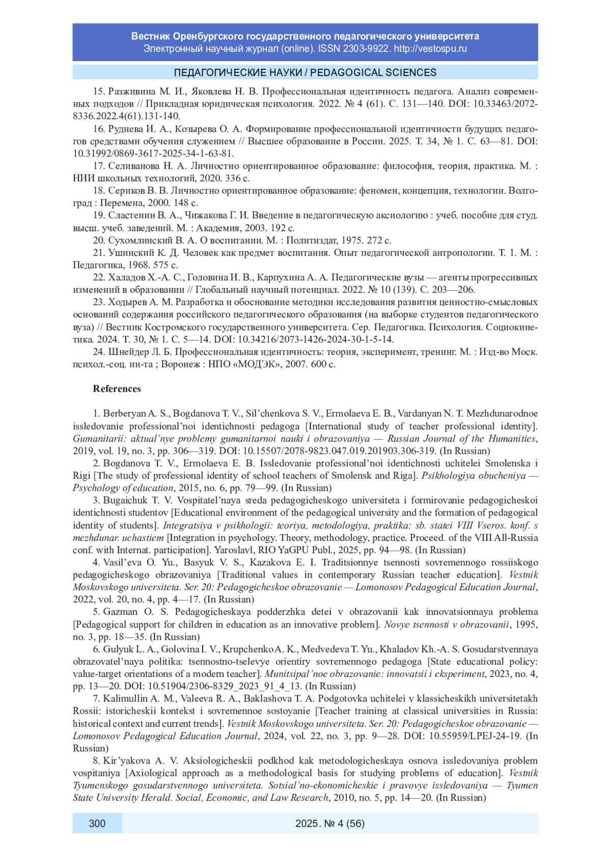 16. Руднева И. А., Козырева О. А. Формирование профессиональной идентичности будущих педагогов средствами обучения служением // Высшее образование в России. 2025. Т. 34, № 1. С. 63-81. DOI: 10.31992/0869-3617-2025-34-1-63-81 EDN: BYVHMX
