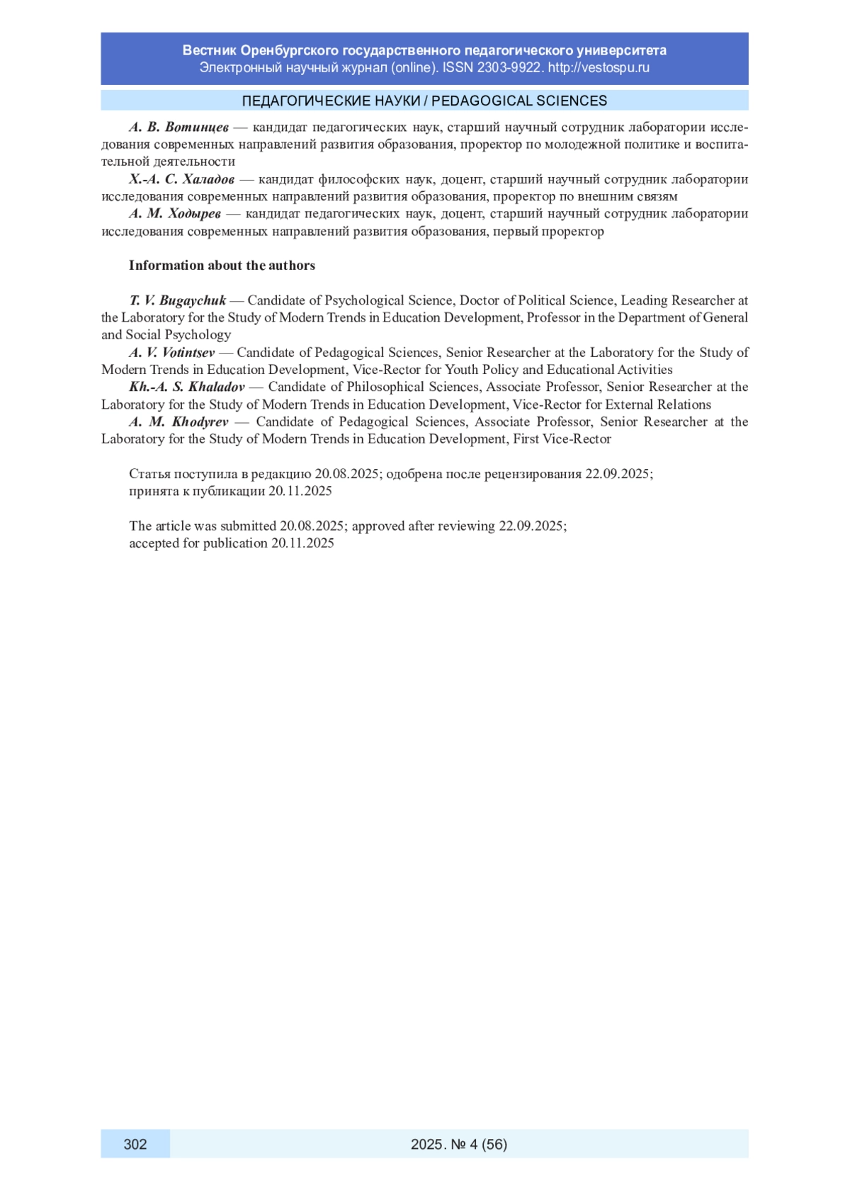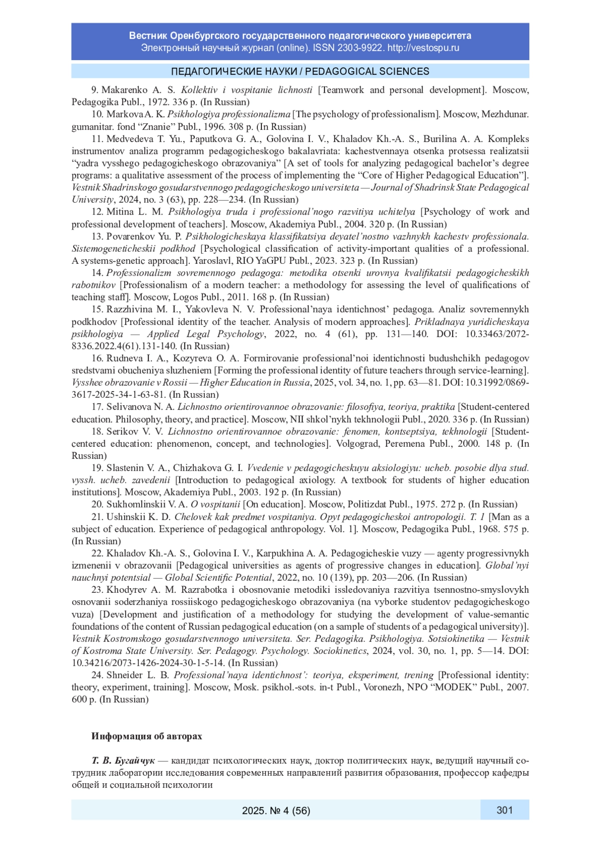 3. Бугайчук Т. В. Воспитательная среда педагогического университета и формирование педагогической идентичности студентов // Интеграция в психологии: теория, методология, практика: сб. статей VIII Всерос. конф. с междунар. участием / под науч. ред. В. А. Мазилова. Ярославль: РИО ЯГПУ, 2025. С. 94-98. EDN: CMEDIA