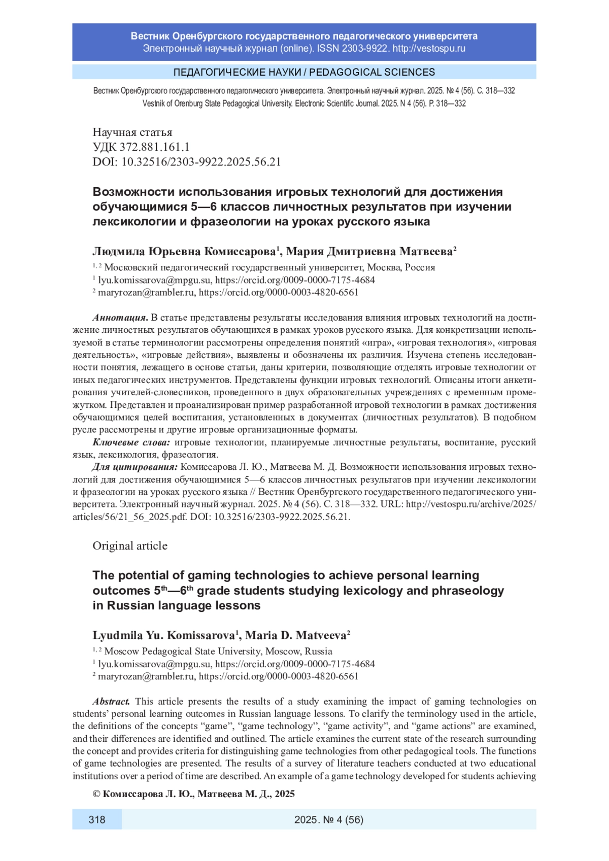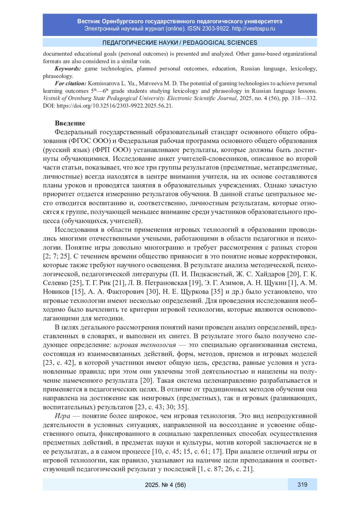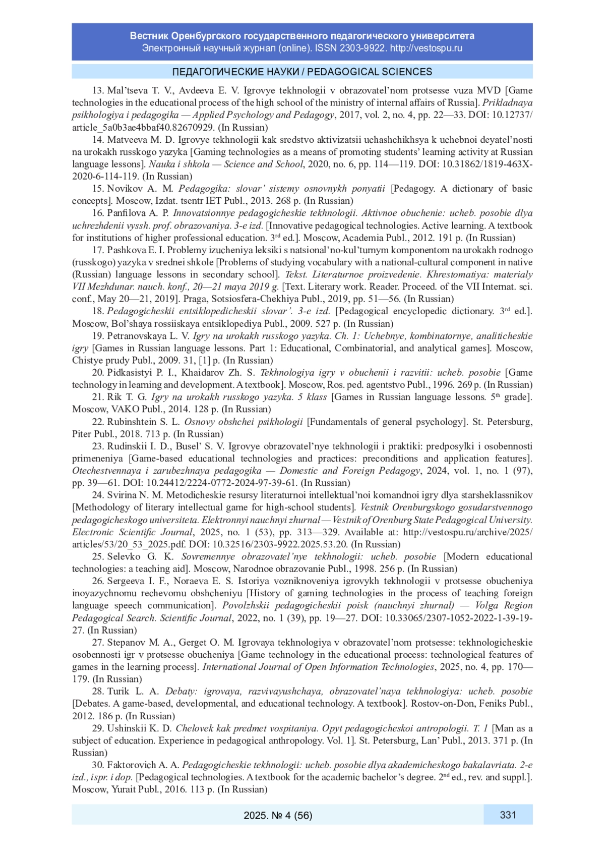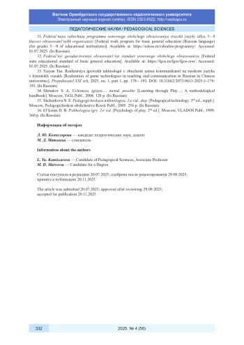 24. Свирина Н. М. Методические ресурсы литературной интеллектуальной командной игры для старшеклассников // Вестник Оренбургского государственного педагогического университета. Электронный научный журнал. 2025. № 1 (53). С. 313-329. URL: http://vestospu.ru/archive/2025/articles/53/20_53_2025.pdf. DOI: 10.32516/2303-9922.2025.53.20 EDN: EJDAGN