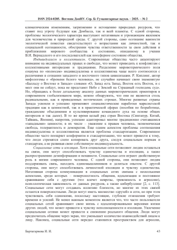 Статья посвящена исследованию социальных причин кризиса человеческой индивидуальности в связи с нарастающей противоречивостью современной общественной динамики. Автор выделяет основные противоречия современного социального развития, такие как технологический прогресс, рост безработицы и экономического неравенства, глобализация и глокализация, распространение социальных сетей и нарастание атомизации, изоляции членов общества и т. п. Сделан вывод о том, что кризис индивидуальности, несмотря на свою сложность, может стать трамплином для глубоких и позитивных социальных трансформаций, а также личностного роста. Кризис - это время изменения, а также фактор, стимулирующий процесс самопознания, в результате которого личность начинает осознавать, какие аспекты жизни требуют изменений, и какое место она хочет занять в обществе.