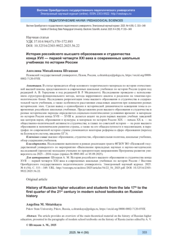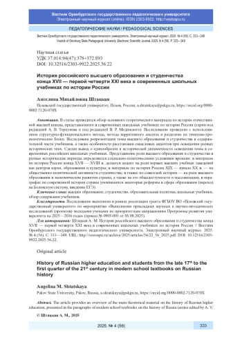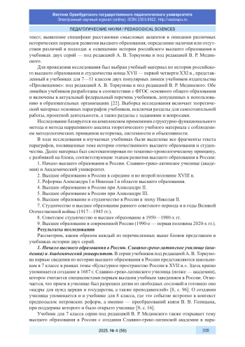 В статье приводится обзор основного теоретического материала по истории отечественной высшей школы, представленного в современных школьных учебниках по истории России (серии под редакцией А. В. Торкунова и под редакцией В. Р. Мединского). Исследование проведено с использованием структурно-функционального метода, метода нарративного анализа и разделено на тематико-хронологические блоки. Исследована репрезентация темы высшего образования и студенчества в содержательной части учебников, а также особенности расстановки смысловых акцентов при освещении разных исторических эпох. Сделан вывод о единообразии и исторической динамичности освещения темы в современных российских школьных учебниках. Представление роли высшего образования и студенчества в разные исторические периоды определяется социально-политическими условиями времени: в материале по истории России конца XVII - XVIII в. делается акцент на роли первых высших учебных заведений как центров науки, образования и культуры; в материале по истории России XIX - начала XX в. - на общественно-политической активности студенчества; в главах по советской истории - на роли высшего образования в экономическом развитии страны, а также на его общедоступности и массовизации; в параграфах по современной истории страны упоминаются некоторые реформы в сфере образования (переход на Болонскую систему, введение ЕГЭ).