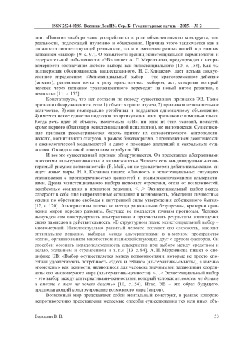 7. Мясникова З. В. Психологические характеристики экзистенциального выбора // Казанский педагогический журнал. - 2019. - № 3. - С. 166-170. EDN: VMKBAA
