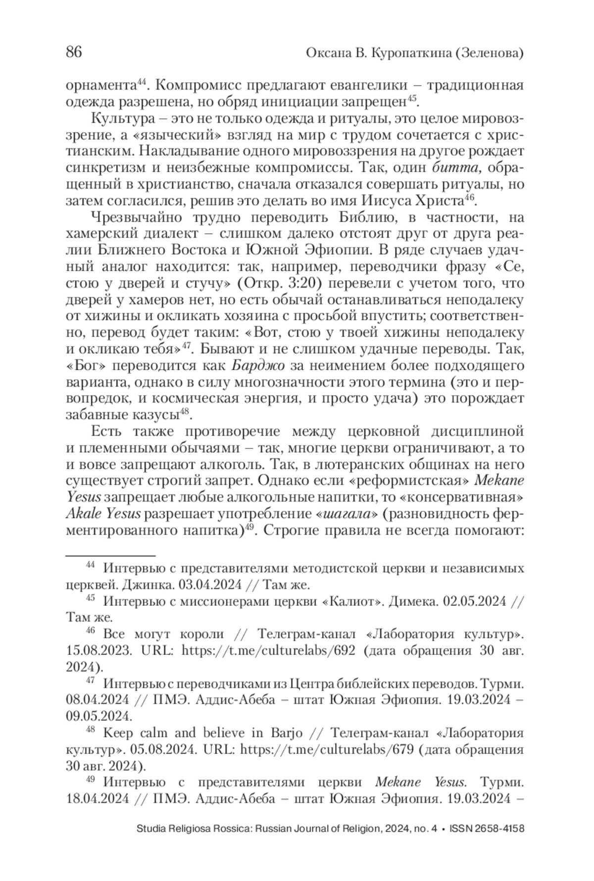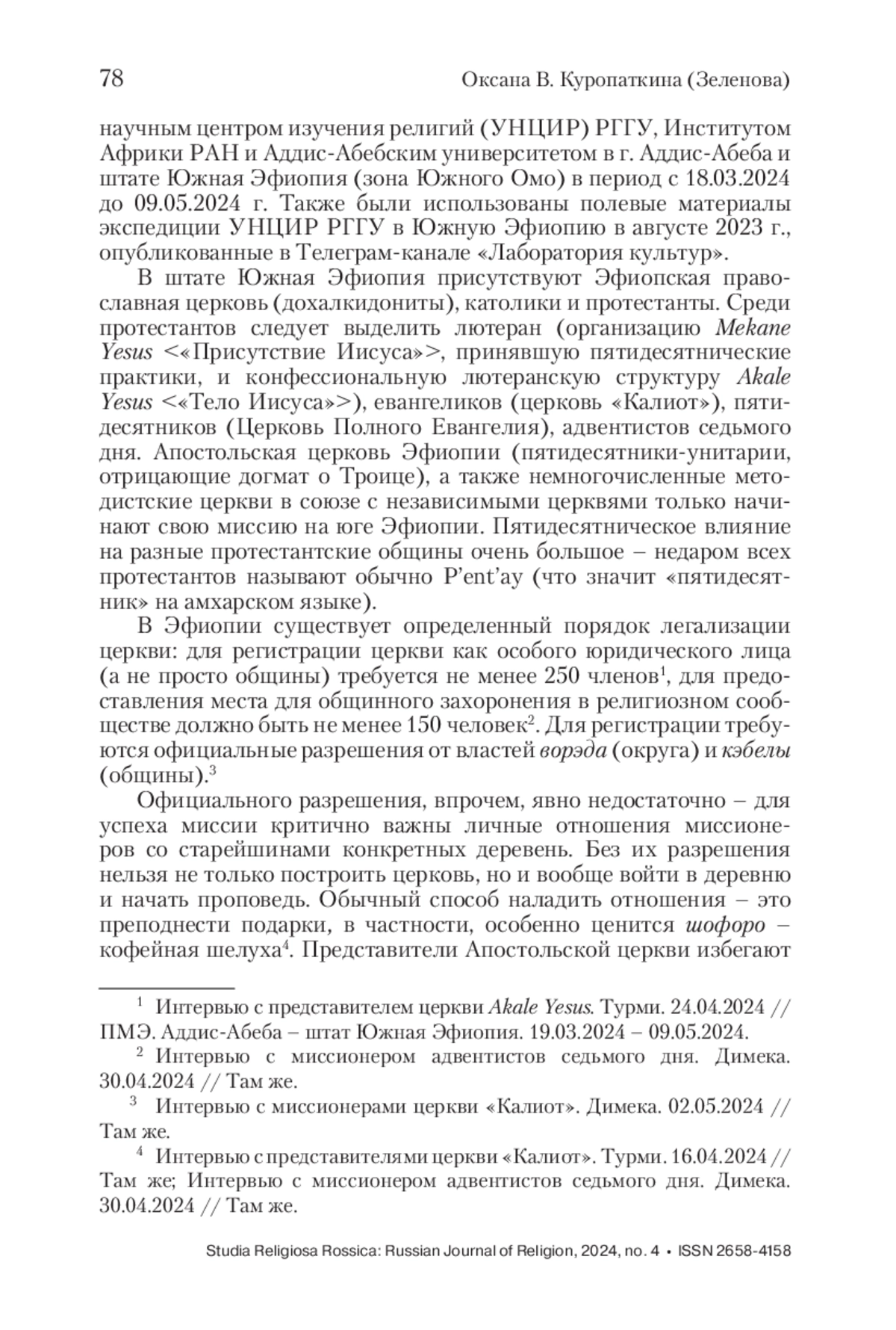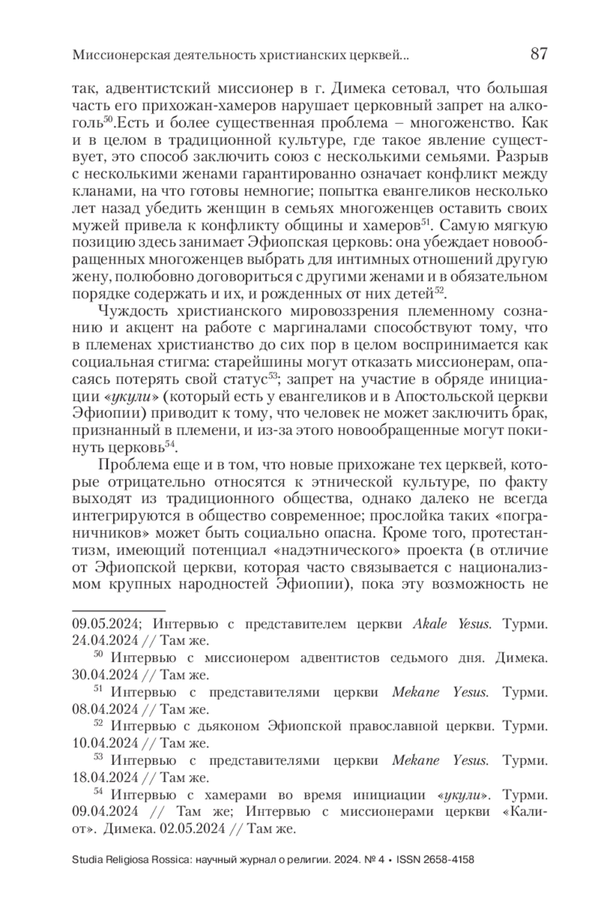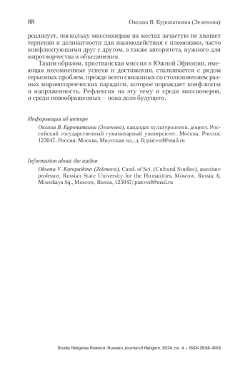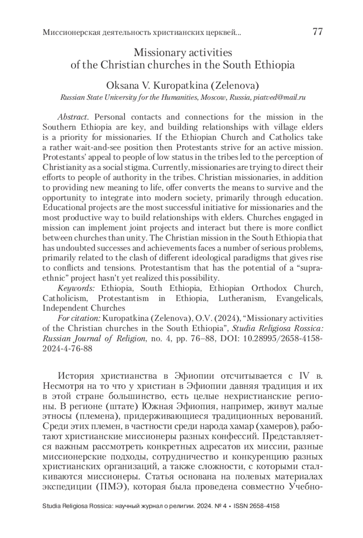 Личные контакты и связи для миссии в Южной Эфиопии носят ключевой характер, налаживание отношений со старейшинами деревень является для миссионеров приоритетной задачей. Если Эфиопская церковь и католики занимают скорее выжидательную позицию, то протестанты стремятся к активной миссии. Обращение протестантов к людям с низким статусом в племени привело к восприятию христианства как социальной стигмы; в настоящее время миссионеры стараются направить свои усилия на авторитетных в племени людей. Христианские миссионеры, помимо нового смысла жизни, предлагают новообращенным средства для выживания и возможность интегрироваться в современное общество, прежде всего через образование. Образовательные проекты – наиболее удачная инициатива миссионеров и наиболее продуктивный способ выстроить отношения со старейшинами. Церкви, занимающиеся миссией, могут реализовывать совместные проекты и взаимодействовать, однако конфликтов между церквями больше, чем единства. Христианская миссия в Южной Эфиопии, имеющая несомненные успехи и достижения, сталкивается с рядом серьезных проблем, прежде всего связанных со столкновением разных мировоззренческих парадигм, которое порождает конфликты и напряженность. Протестантизм, имеющий потенциал «надэтнического» проекта, пока эту возможность не реализует.