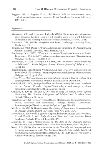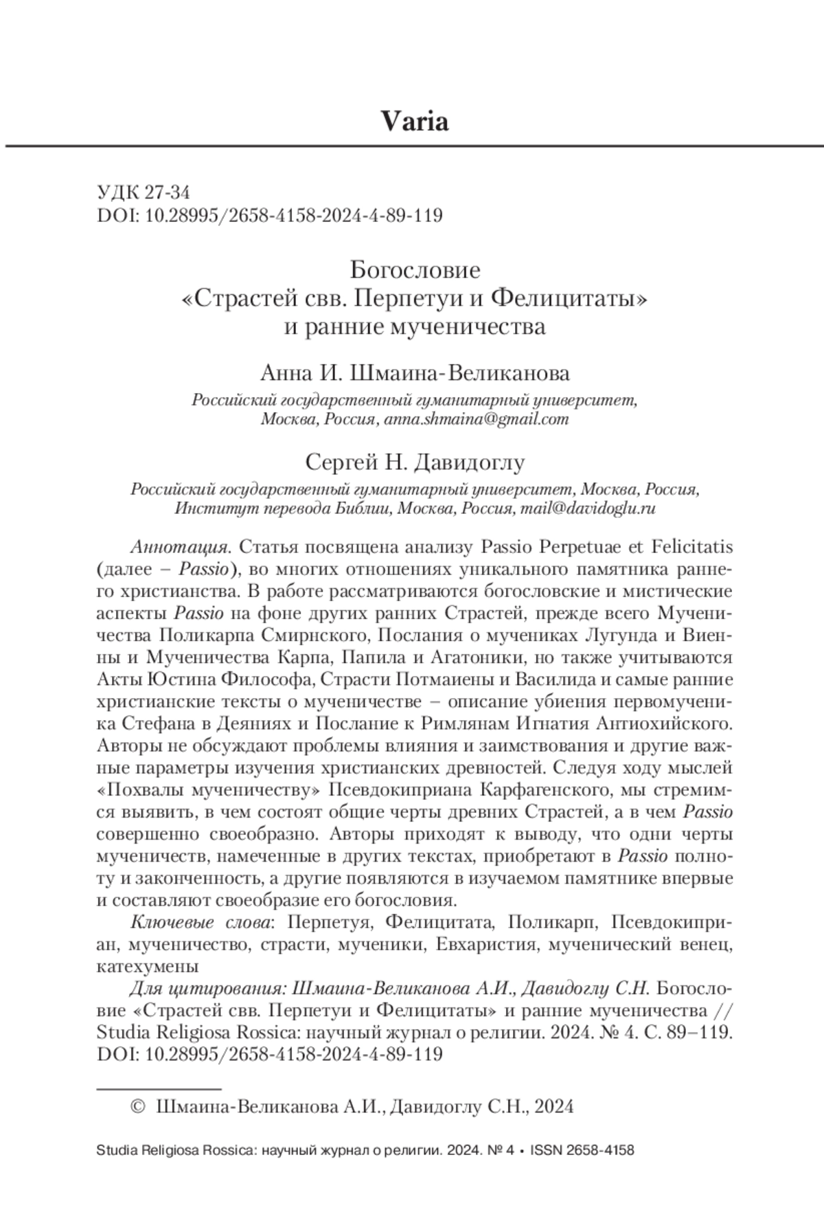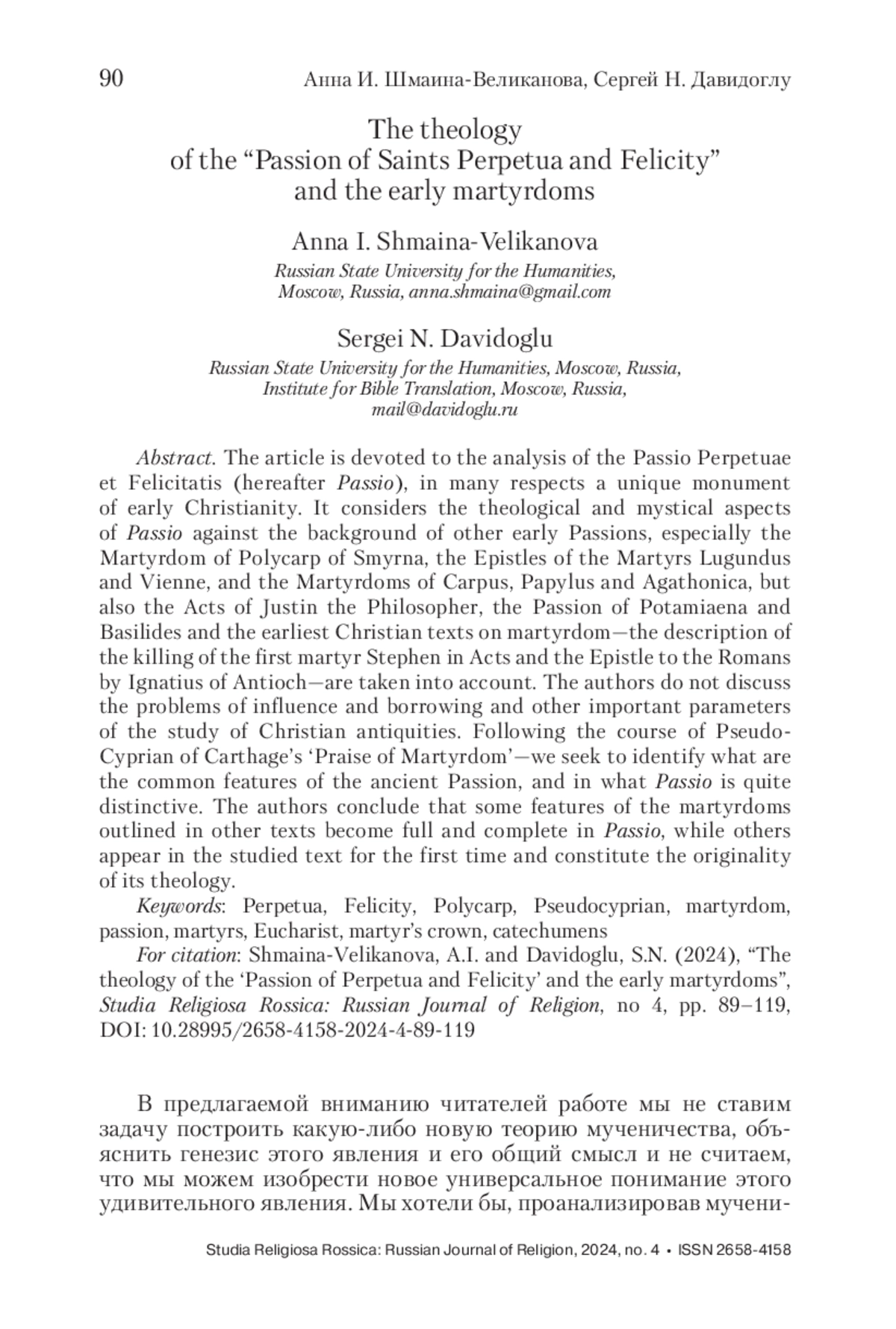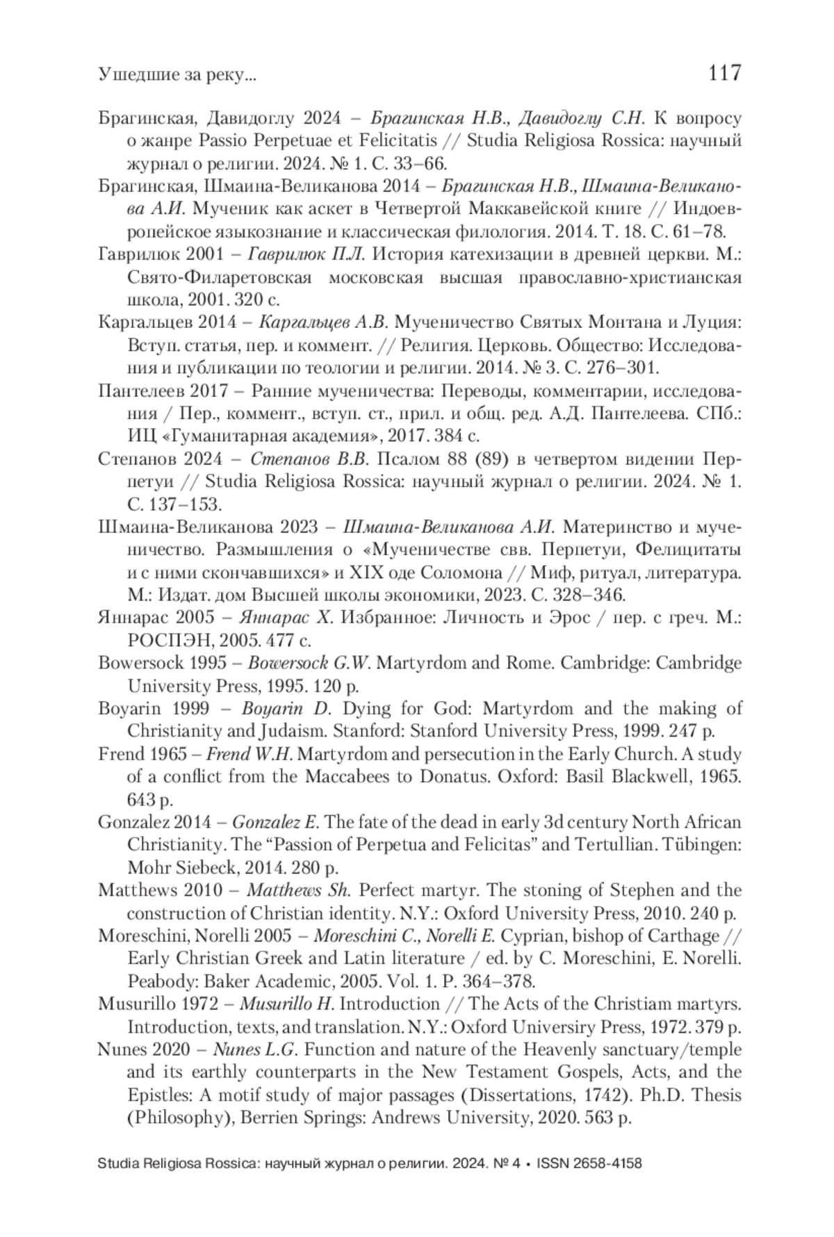 3. Брагинская, Давидоглу 2024 - Брагинская Н.В., Давидоглу С.Н. К вопросу о жанре Passio Perpetuae et Felicitatis // Studia Religiosa Rossica: научный журнал о религии. 2024. № 1. С. 33-66.