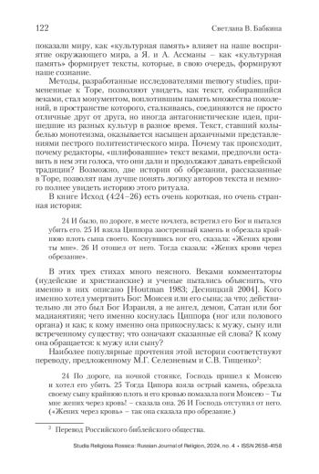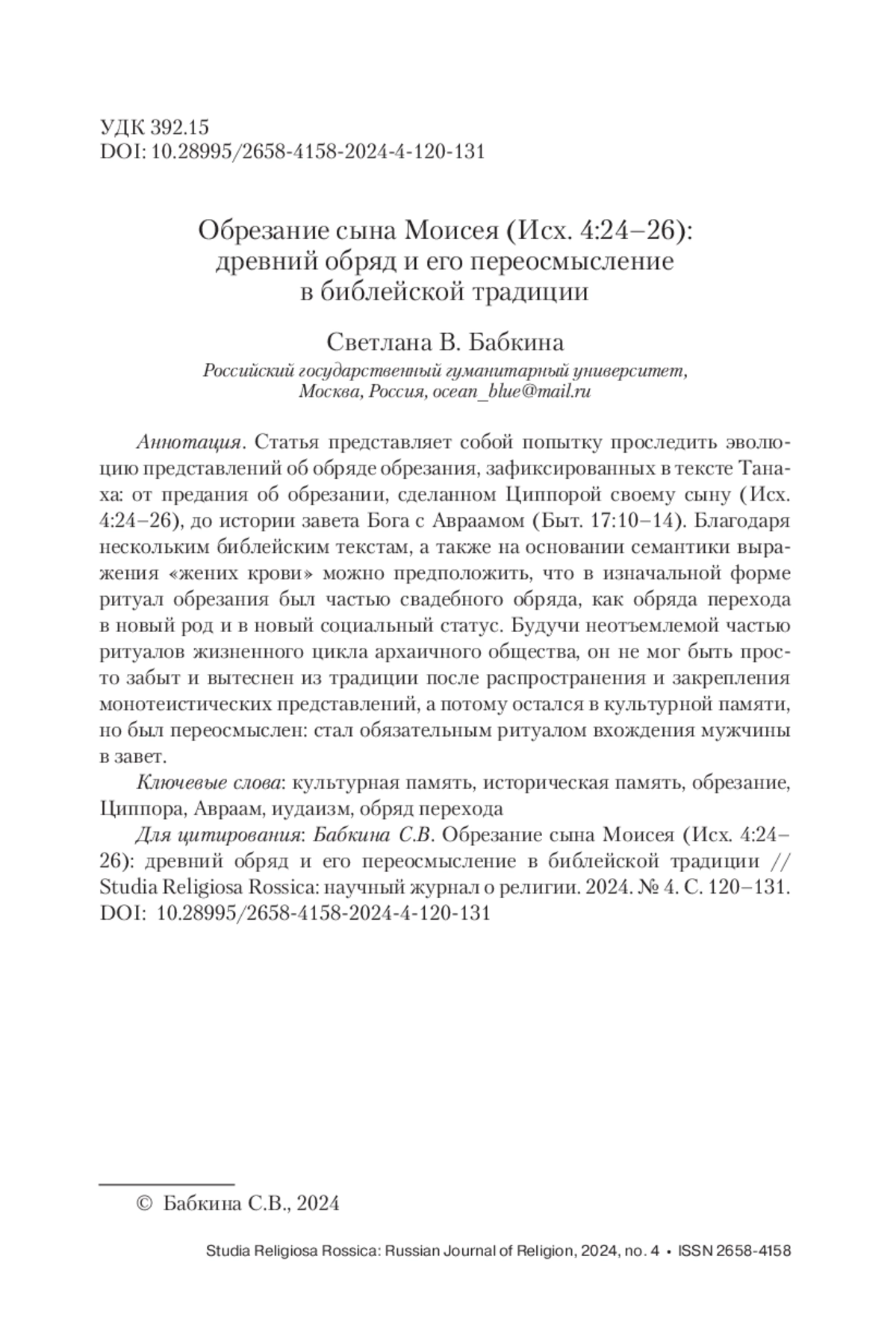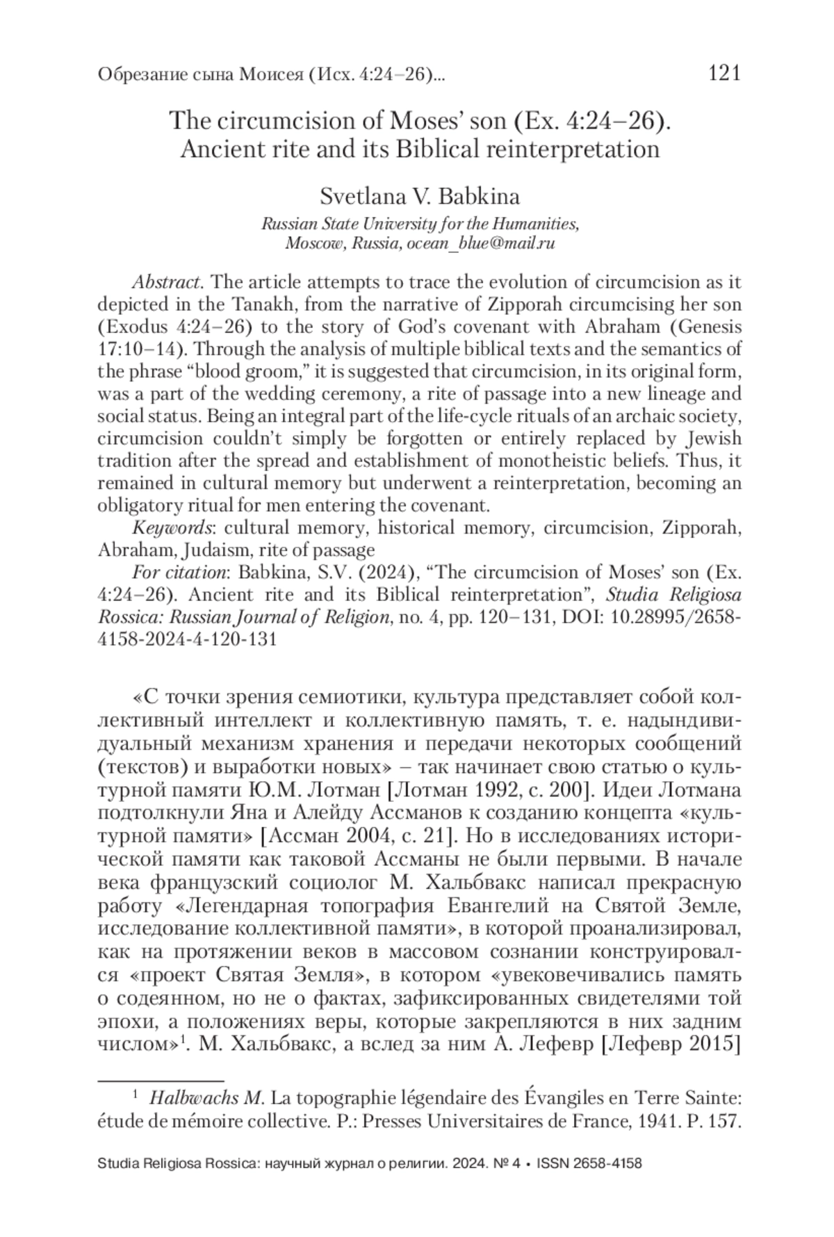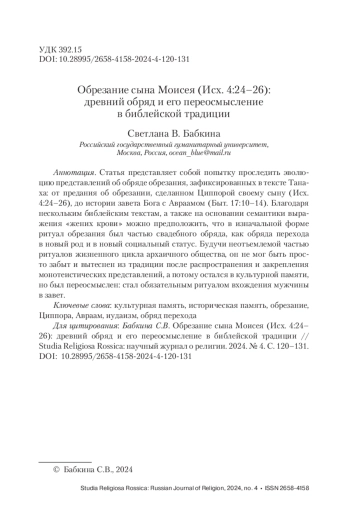 Статья представляет собой попытку проследить эволюцию представлений об обряде обрезания, зафиксированных в тексте Танаха: от предания об обрезании, сделанном Циппорой своему сыну (Исх. 4:24–26), до истории завета Бога с Авраамом (Быт. 17:10–14). Благодаря нескольким библейским текстам, а также на основании семантики выражения «жених крови» можно предположить, что в изначальной форме ритуал обрезания был частью свадебного обряда, как обряда перехода в новый род и в новый социальный статус. Будучи неотъемлемой частью ритуалов жизненного цикла архаичного общества, он не мог быть просто забыт и вытеснен из традиции после распространения и закрепления монотеистических представлений, а потому остался в культурной памяти, но был переосмыслен: стал обязательным ритуалом вхождения мужчины в завет.