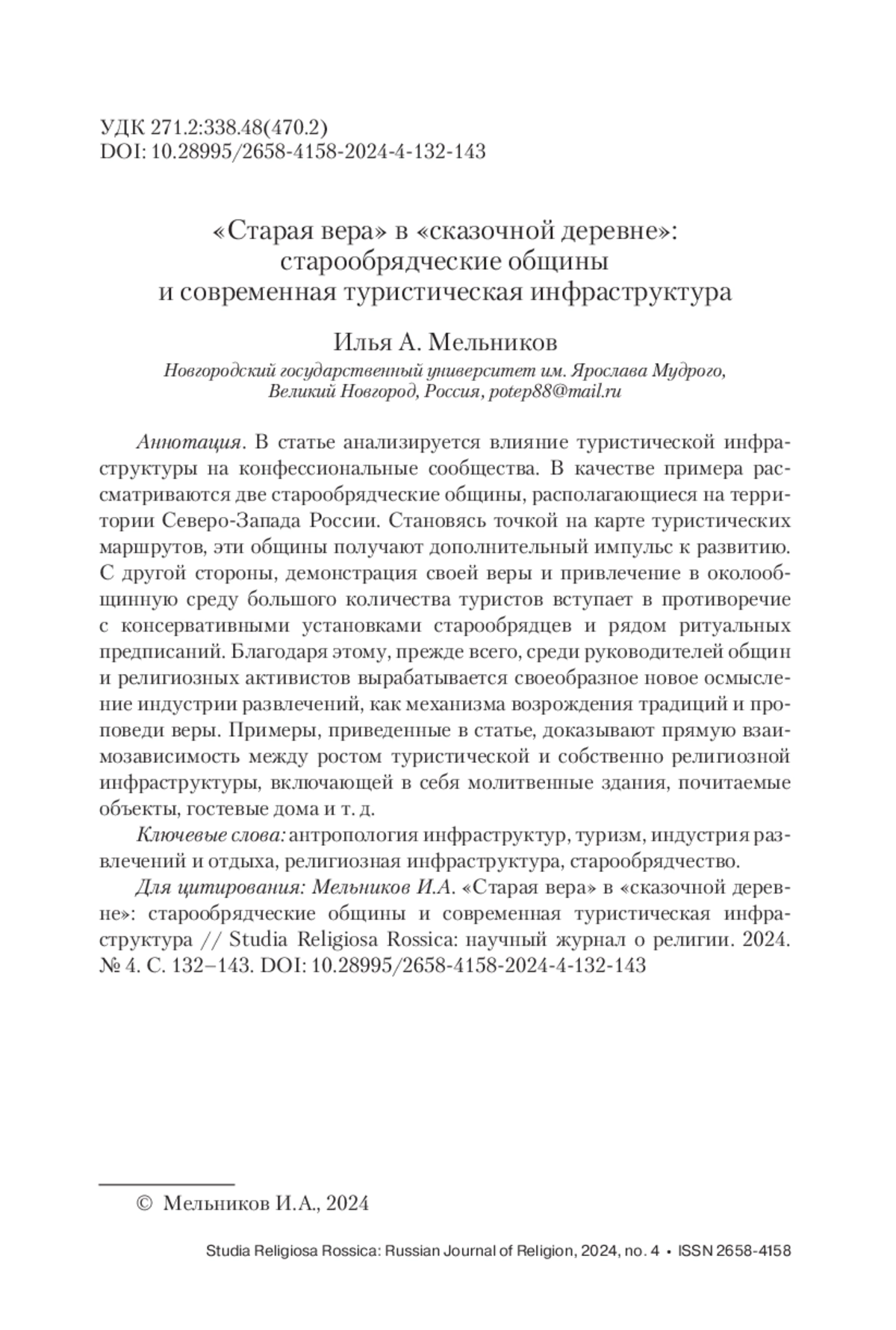 В статье анализируется влияние туристической инфраструктуры на конфессиональные сообщества. В качестве примера рассматриваются две старообрядческие общины, располагающиеся на территории Северо-Запада России. Становясь точкой на карте туристических маршрутов, эти общины получают дополнительный импульс к развитию. С другой стороны, демонстрация своей веры и привлечение в околообщинную среду большого количества туристов вступает в противоречие с консервативными установками старообрядцев и рядом ритуальных предписаний. Благодаря этому, прежде всего, среди руководителей общин и религиозных активистов вырабатывается своеобразное новое осмысление индустрии развлечений, как механизма возрождения традиций и проповеди веры. Примеры, приведенные в статье, доказывают прямую взаимозависимость между ростом туристической и собственно религиозной инфраструктуры, включающей в себя молитвенные здания, почитаемые объекты, гостевые дома и т. д.