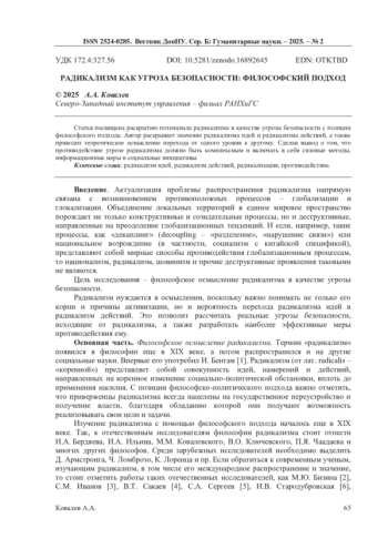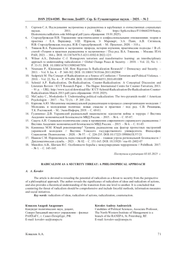 Статья посвящена раскрытию потенциала радикализма в качестве угрозы безопасности с позиции философского подхода. Автор раскрывает значение радикализма идей и радикализма действий, а также приводит теоретическое осмысление перехода от одного уровня к другому. Сделан вывод о том, что противодействие угрозе радикализма должно быть комплексным и включать в себя силовые методы, информационные меры и социальные инициативы.