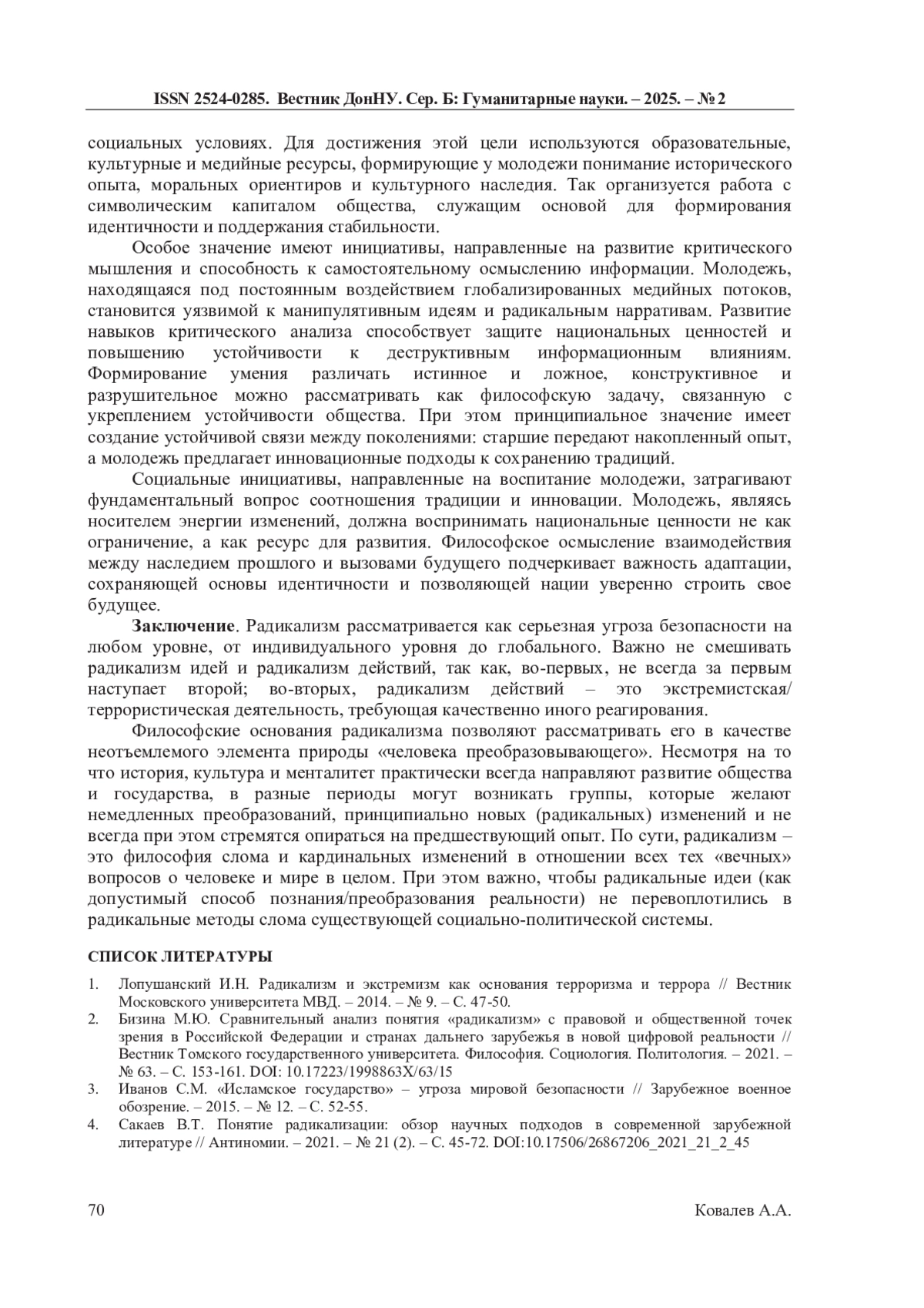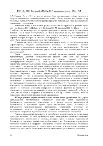 4. Сакаев В.Т. Понятие радикализации: обзор научных подходов в современной зарубежной литературе // Антиномии. - 2021. - № 21 (2). - С. 45-72. DOI: 10.17506/26867206_2021_21_2_45 EDN: ELFNAI