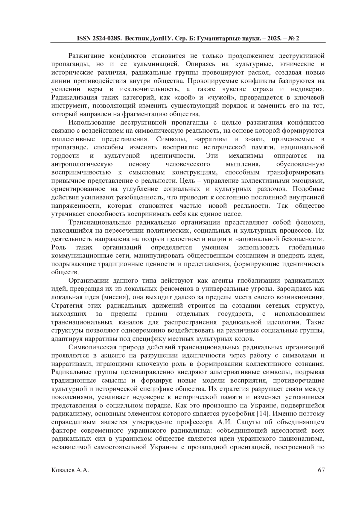 15. Сацута А.И. Социально-политические силы и проявления современного украинского радикализма // Вестник Академии экономической безопасности МВД России. - 2015. - № 6. - С. 81-85.