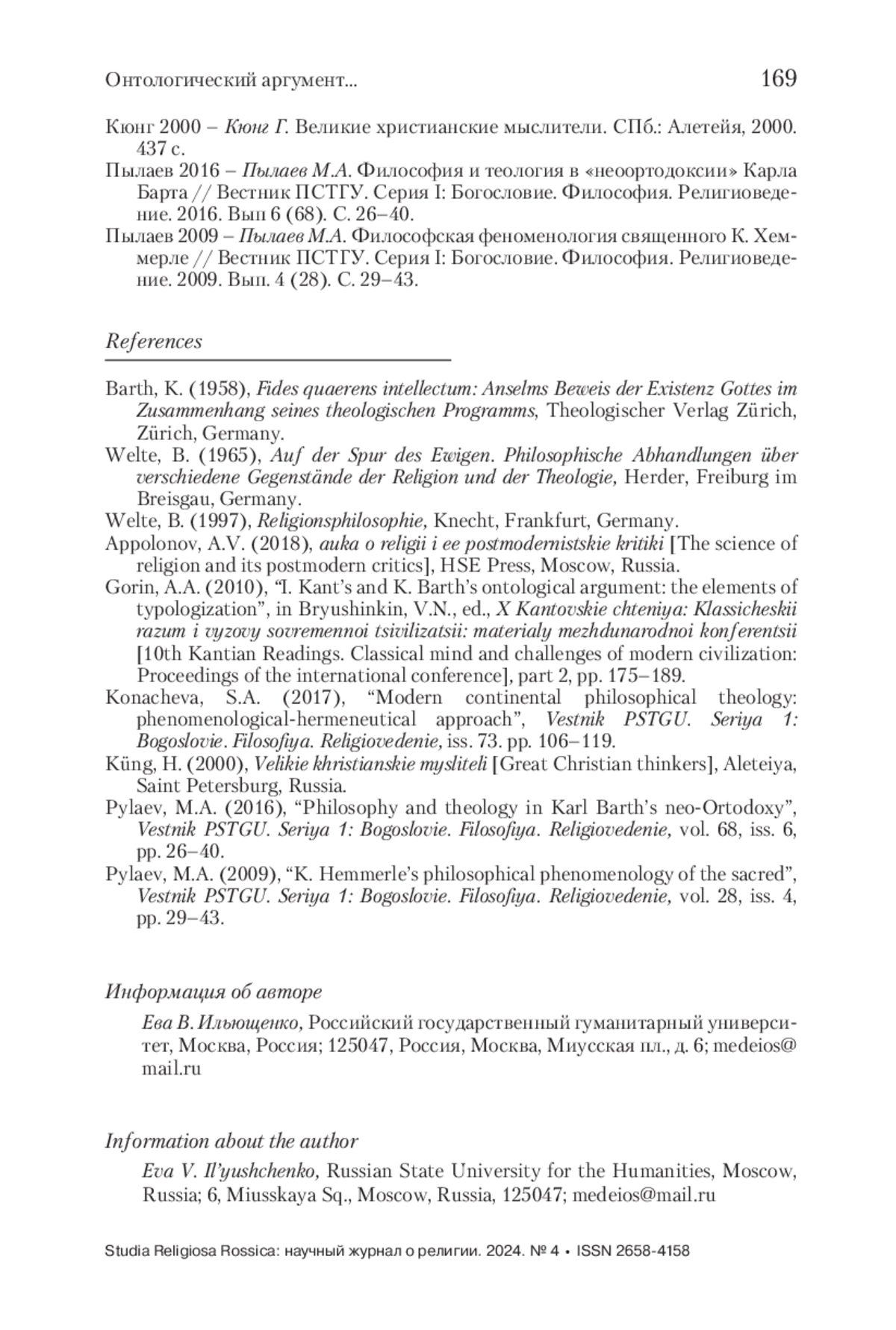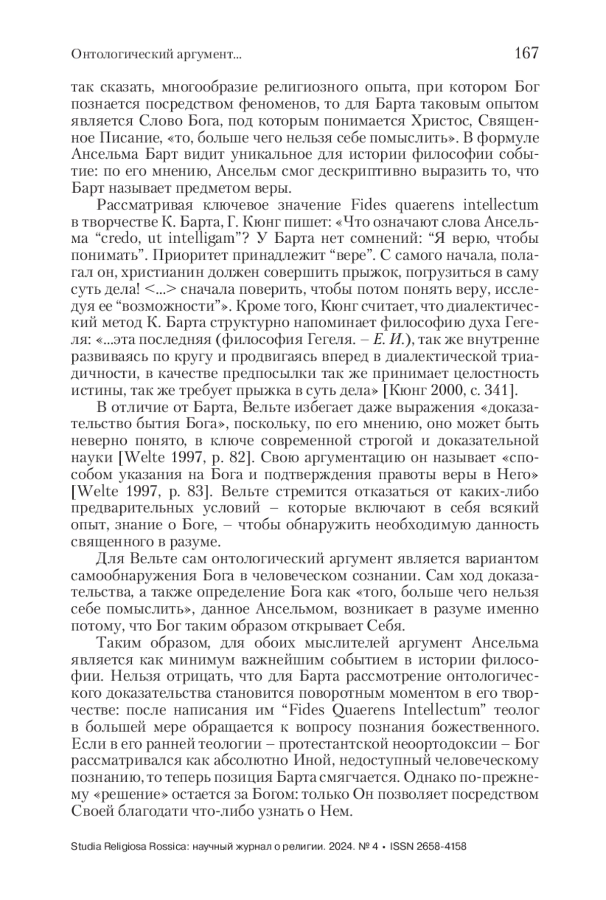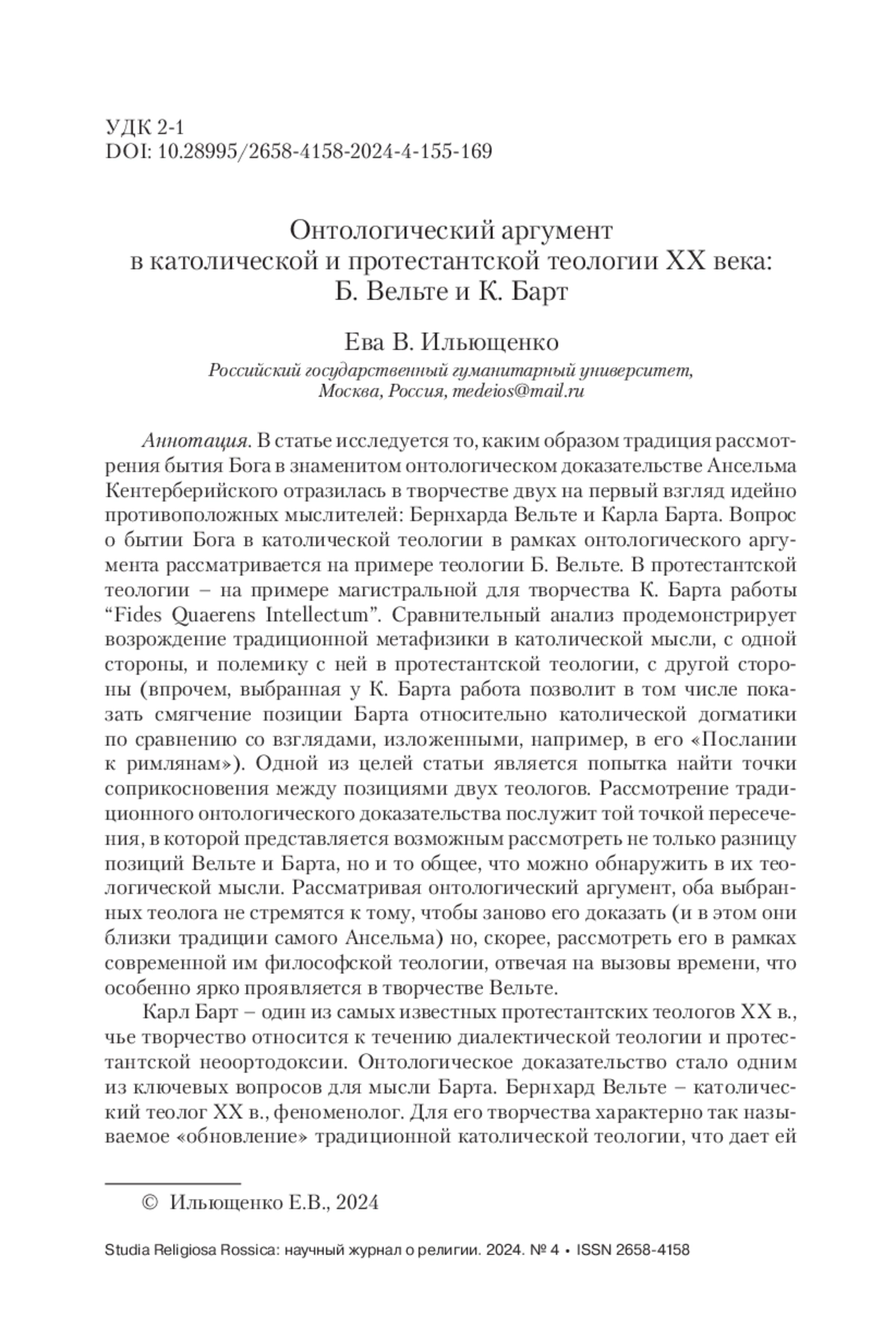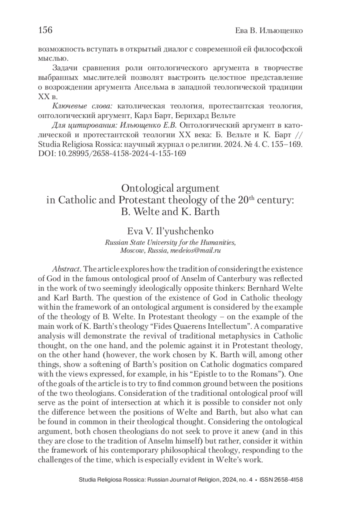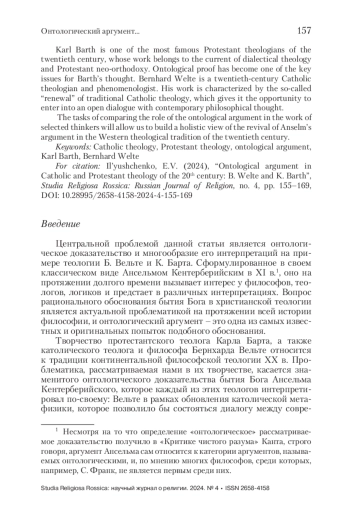 В статье исследуется то, каким образом традиция рассмотрения бытия Бога в знаменитом онтологическом доказательстве Ансельма Кентерберийского отразилась в творчестве двух на первый взгляд идейно противоположных мыслителей: Бернхарда Вельте и Карла Барта. Вопрос о бытии Бога в католической теологии в рамках онтологического аргумента рассматривается на примере теологии Б. Вельте. В протестантской теологии – на примере магистральной для творчества К. Барта работы “Fides Quaerens Intellectum”. Сравнительный анализ продемонстрирует возрождение традиционной метафизики в католической мысли, с одной стороны, и полемику с ней в протестантской теологии, с другой стороны (впрочем, выбранная у К. Барта работа позволит в том числе показать смягчение позиции Барта относительно католической догматики по сравнению со взглядами, изложенными, например, в его «Послании к римлянам»). Одной из целей статьи является попытка найти точки соприкосновения между позициями двух теологов. Рассмотрение традиционного онтологического доказательства послужит той точкой пересечения, в которой представляется возможным рассмотреть не только разницу позиций Вельте и Барта, но и то общее, что можно обнаружить в их теологической мысли. Рассматривая онтологический аргумент, оба выбранных теолога не стремятся к тому, чтобы заново его доказать (и в этом они близки традиции самого Ансельма) но, скорее, рассмотреть его в рамках современной им философской теологии, отвечая на вызовы времени, что особенно ярко проявляется в творчестве Вельте.