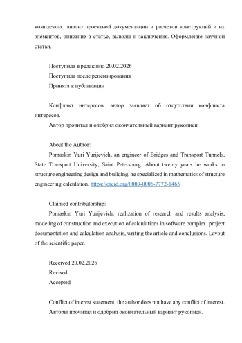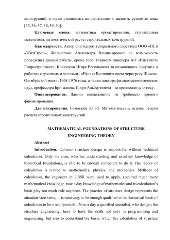 Аннотация Введение. Оптимальное проектирование строительных конструкций невозможно без их расчета. Грамотный расчет возможен только при понимании и глубоких знаниях теоретических основ. Теория расчета связана с математикой, физикой и механикой. Методы расчета, которыми пользовались инженеры в СССР требовали больших математических знаний, теперь математика расчета, его основа, практически выведена за пределы. Практика проектирования говорит об обратном, о необходимости владения математической основой расчета. Современный специалист, выполняющий расчет строительных конструкций, должен обладать не только навыками программирования, инженерными знаниями, но и понимать, что стоит за расчетом строительных конструкций. Только знание базы расчета позволит инженеру контролировать весь процесс расчета и повернуть его в нужном направлении на оптимизацию конструкции и увеличение ее срока службы. Цель работы состоит в сравнительном анализе расчета конструкции моста аналитическим и численными методами, при обосновании их взаимозаменяемости. В данном случае в работе представлены только методики выполненных расчетов, обоснованная их база и результаты анализа с заключительными выводами. Материалы и методы. В качестве методов исследования в работе использованы, прежде всего: анализ архивных данных, проектной документации, книг и иных нормативных и технических источников, справочников, а также численных и математических моделей и связанных с ними документов. К методам исследования, использованным в данной статье также, можно отнести теоретические методы как: моделирование, анализ, синтез, индукция, дедукция, сопоставительный анализ и контент-анализ; аналитические методы: создание прототипов и формирование гипотезы; научные методы: численный эксперимент и анализ его результатов. Результаты исследования. Дана математическая формулировка и обоснование теоретической базы для расчета строительных конструкций любой формы при любых типах нагружения в произвольной постановке задачи, которая в последствии может быть использована для программирования сложных расчетов и работы строительных конструкций в реальном времени, а также для проведения численных экспериментов с помощью программирования. Выполнен анализ различных методов и методик с заключительными выводами об их комплементарности. Обсуждения и заключение. Проведенное исследование позволило оценить различные методы и методики расчёта строительных конструкций, разобраться в том, что все они имеют свои ограничения, плюсы и минусы и прийти к заключению о том, что накопленная теоретическая база, результаты экспериментов и, в том числе, исследование, проделанное в этой работе, позволяют внедрять и использовать новую методику, основанную на программировании с применением математической теории. Подобная практика позволит повысить точность расчета, спрогнозировать поведение конструкций, а также сэкономить на испытаниях и выявить уязвимые зоны [35, 36, 37, 38, 39, 40]. Ключевые слова: математика проектирования, строительная математика, математический расчет строительных конструкций.