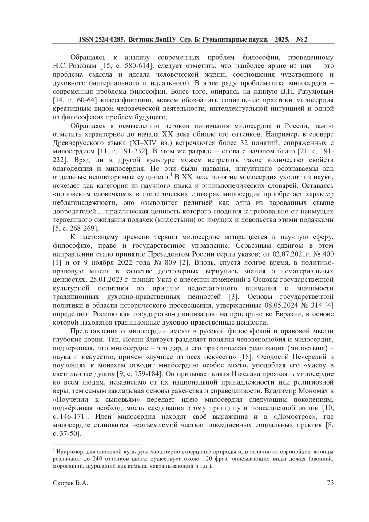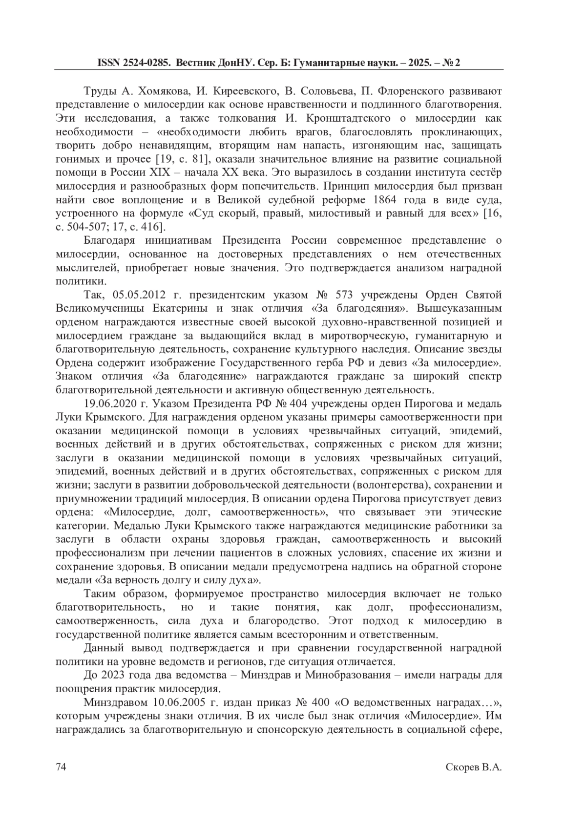 Статья посвящена исследованию феномена милосердия как ключевого ориентира современности. Рассмотрены основные подходы к понятию милосердия в отечественной философской мысли; проанализировано современное понимание милосердия через призму системы наград, отражающей признание и поощрение проявлений этой ценности. Автор делает вывод, что ценность милосердия находит свое отражение в государственной политике, что делает её элементом российской идентичности. Становясь всё более значимой ценностью, милосердие играет важную роль в сохранении суверенитета и культурно-исторического наследия России.