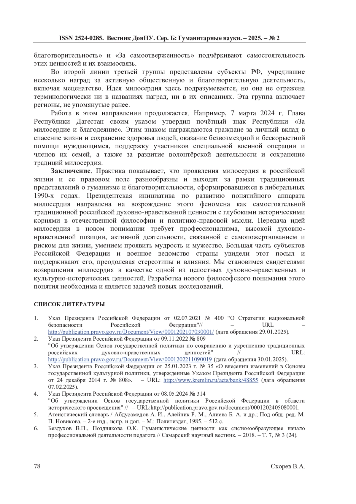 2. Указ Президента Российской Федерации от 09.11.2022 № 809 “Об утверждении Основ государственной политики по сохранению и укреплению традиционных российских духовно-нравственных ценностей” // - URL: http://publication.pravo.gov.ru/Document/View/0001202211090019 (дата обращения 30.01.2025).