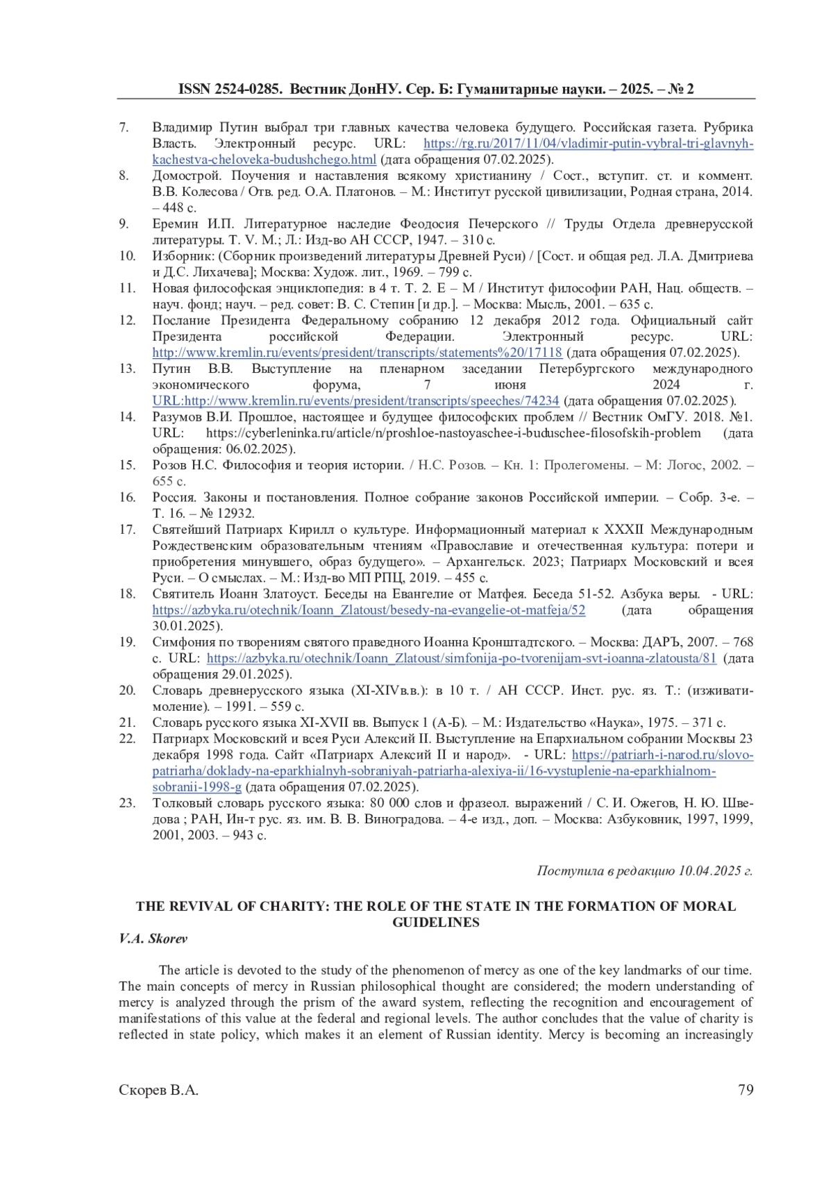 7. Владимир Путин выбрал три главных качества человека будущего. Российская газета. Рубрика Власть. Электронный ресурс. URL: https://rg.ru/2017/11/04/vladimir-putin-vybral-tri-glavnyh- kachestva-cheloveka-budushchego.html (дата обращения 07.02.2025).