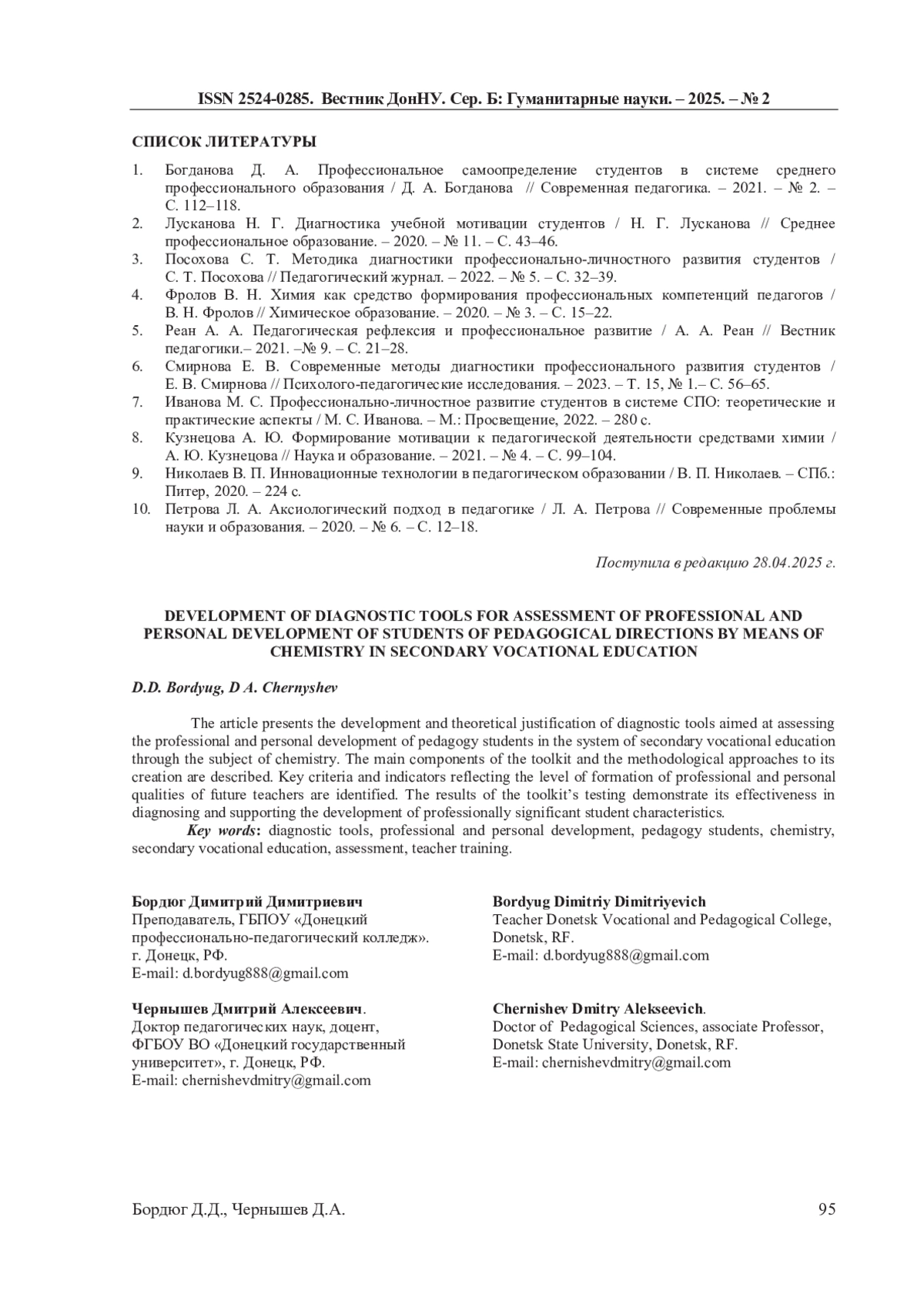 1. Богданова Д. А. Профессиональное самоопределение студентов в системе среднего профессионального образования / Д. А. Богданова // Современная педагогика. - 2021. - № 2. - С. 112-118.