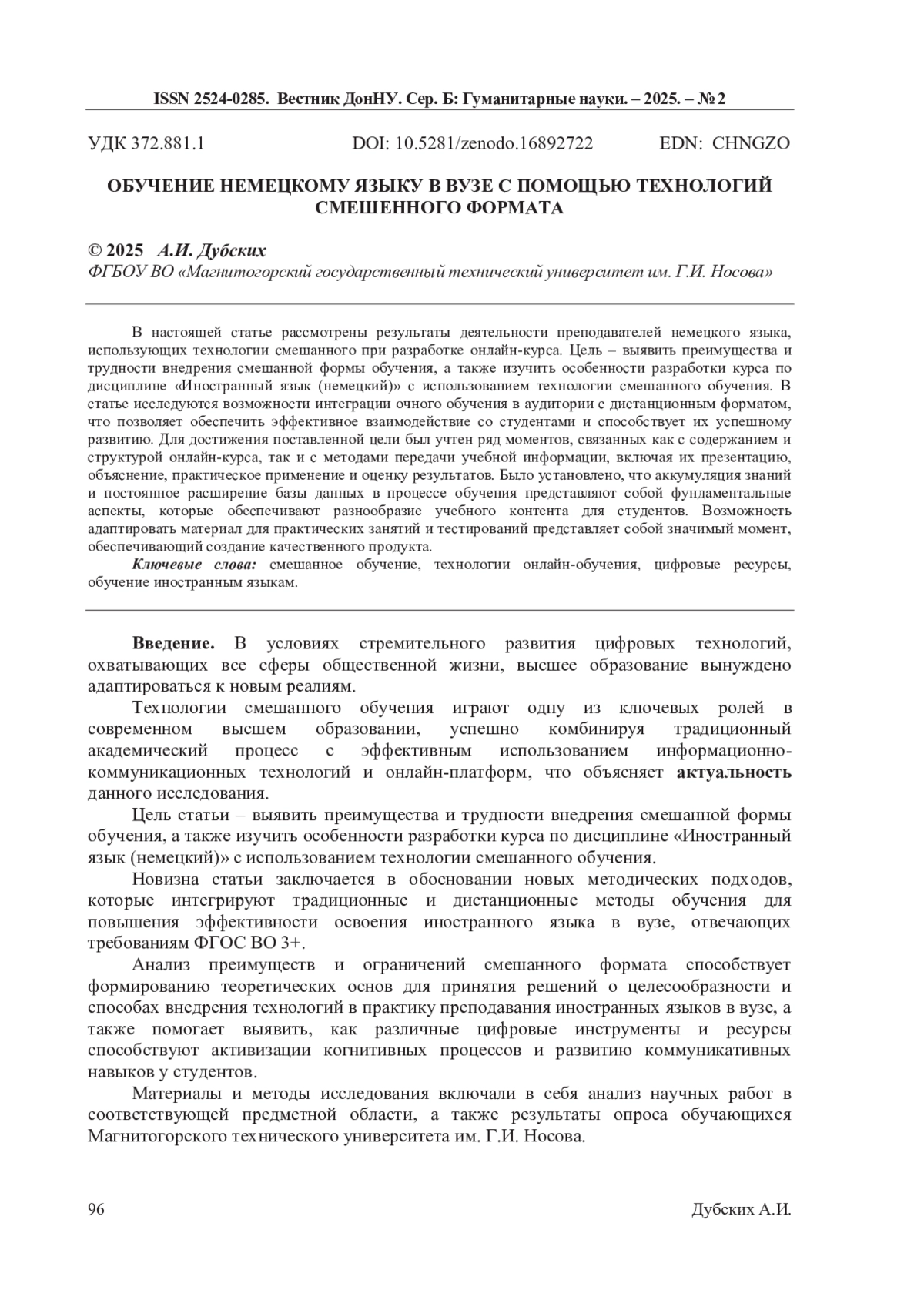 Цель - выявить преимущества и трудности внедрения смешанной формы обучения, а также изучить особенности разработки курса по дисциплине «Иностранный язык (немецкий)» с использованием технологии смешанного обучения. В статье исследуются возможности интеграции очного обучения в аудитории с дистанционным форматом, что позволяет обеспечить эффективное взаимодействие со студентами и способствует их успешному развитию. Для достижения поставленной цели был учтен ряд моментов, связанных как с содержанием и структурой онлайн-курса, так и с методами передачи учебной информации, включая их презентацию, объяснение, практическое применение и оценку результатов. Было установлено, что аккумуляция знаний и постоянное расширение базы данных в процессе обучения представляют собой фундаментальные аспекты, которые обеспечивают разнообразие учебного контента для студентов. Возможность адаптировать материал для практических занятий и тестирований представляет собой значимый момент, обеспечивающий создание качественного продукта.
