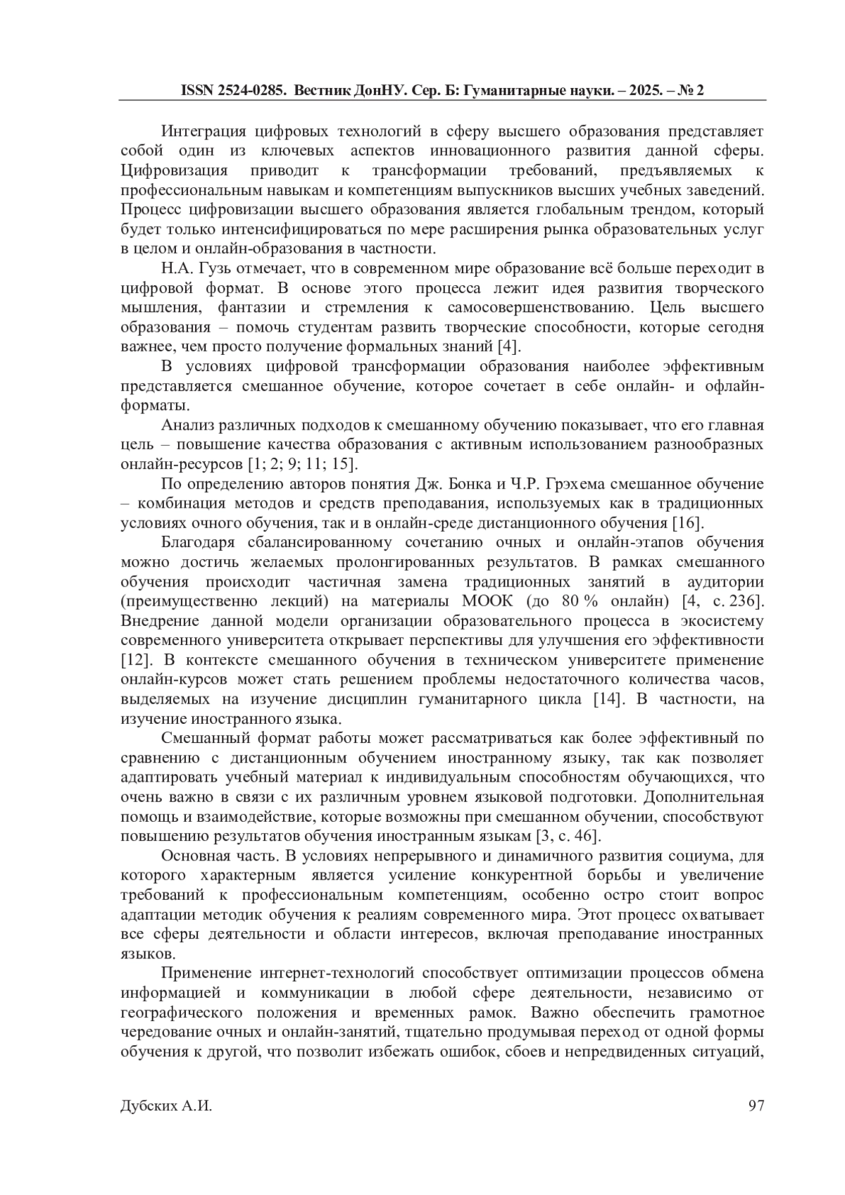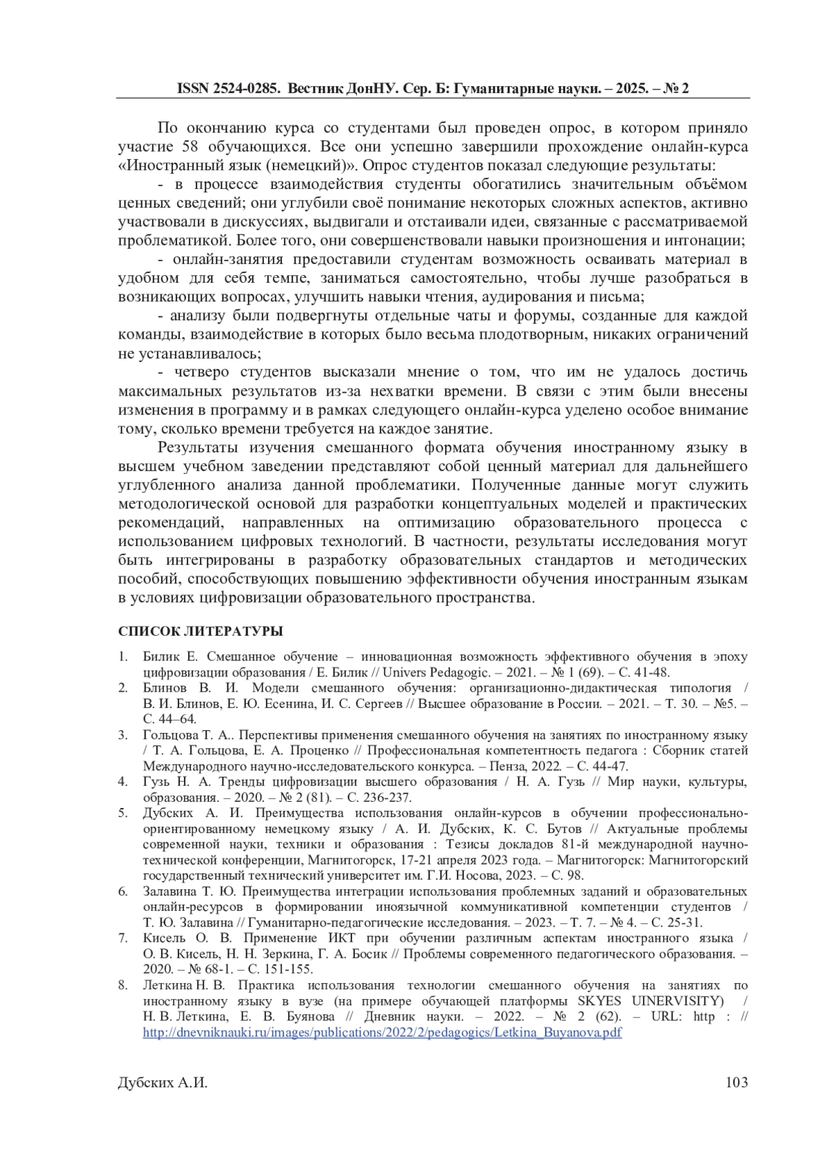 5. Дубских А. И. Преимущества использования онлайн-курсов в обучении профессиональноориентированному немецкому языку / А. И. Дубских, К. С. Бутов // Актуальные проблемы современной науки, техники и образования: Тезисы докладов 81-й международной научно- технической конференции, Магнитогорск, 17-21 апреля 2023 года. - Магнитогорск: Магнитогорский государственный технический университет им. Г.И. Носова, 2023. - С. 98. EDN: QBCONK